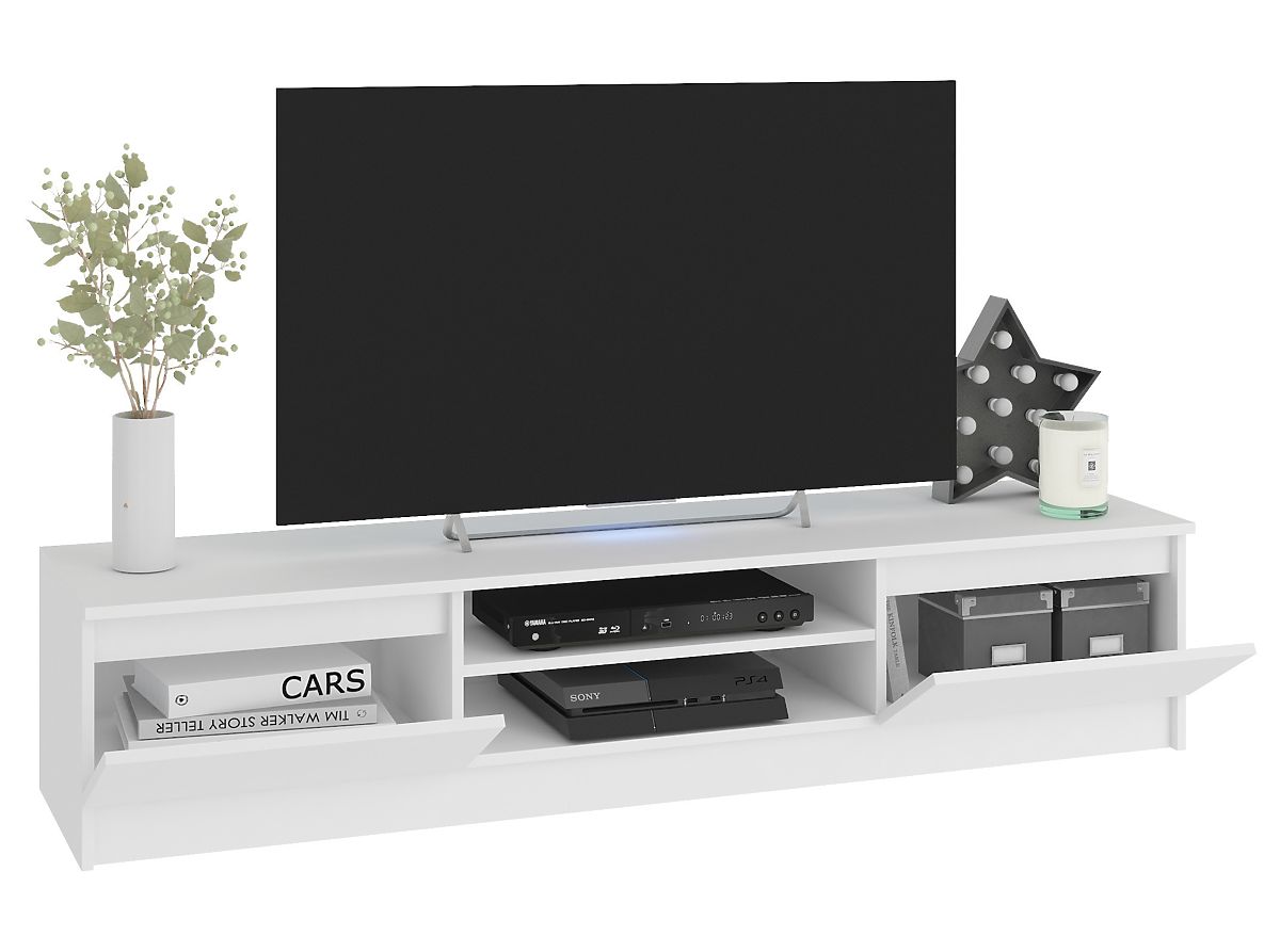 The furniture set, consisting of a TV cabinet and two wall-mounted cabinets, can be a functional addition to a living room, study, or student room. The TV cabinet has a large top surface that can accommodate a TV of any size and decorative items. The furniture is equipped with practical shelves for electronics and side storage spaces with flip doors, where DVDs, computer accessories, or other small items can be stored. The TV stand, combined with the wall-mounted cabinets on its sides, creates a visually attractive composition. The furniture takes up little space, making it suitable not only for a large living room but also for smaller spaces.