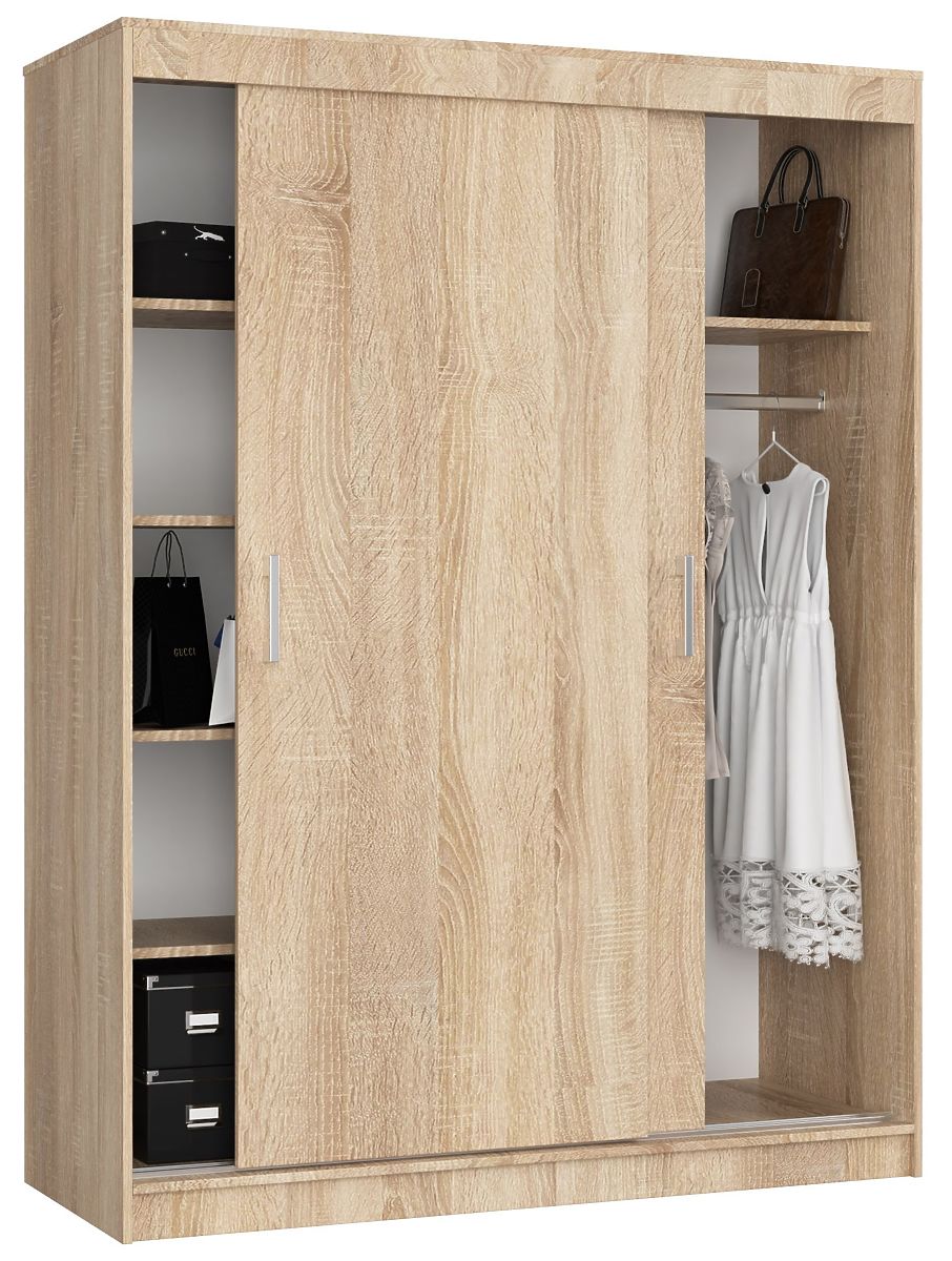 When buying a wardrobe, we aim for it to be practical and accommodate as much of our clothing and accessories as possible. Our sliding wardrobe CLP with a height of 200 cm and a width of 150 cm definitely meets these conditions! Thanks to 6 deep shelves and a rod, you can easily store not only regular t-shirts but also elegant dresses, suits, or jackets. What else distinguishes our wardrobe? The oak sonoma finish is ideally suited for simple, minimalist, Scandinavian interiors. It will also certainly match well with white walls.