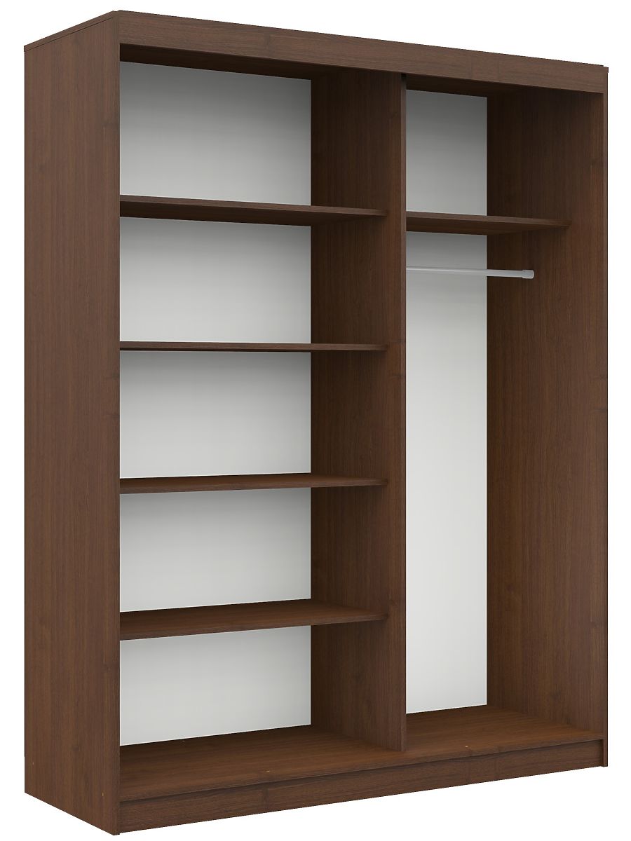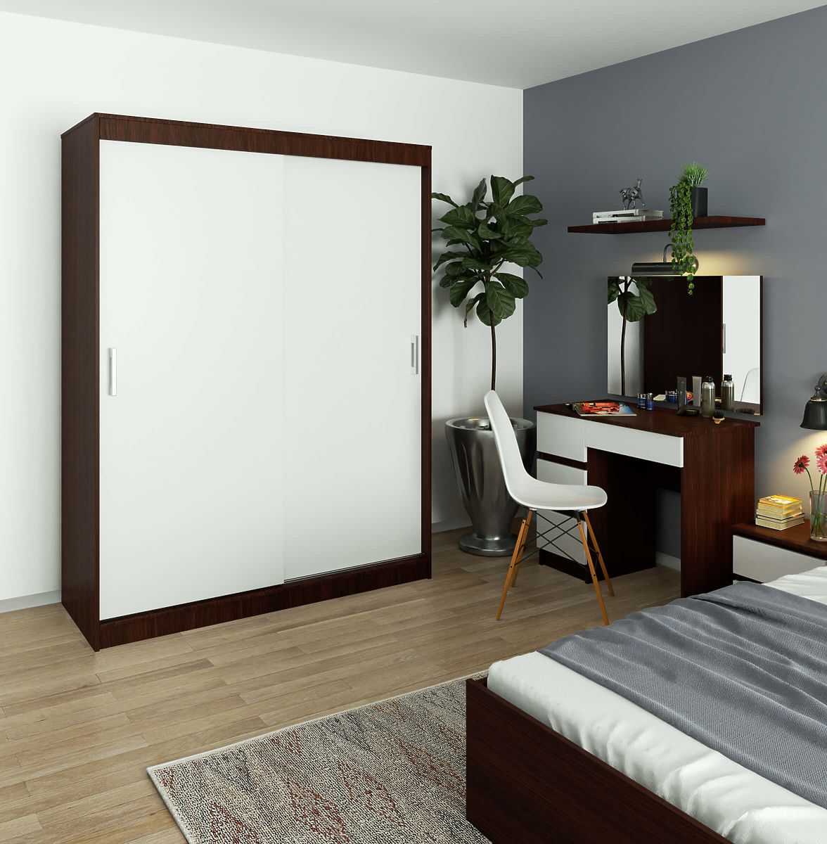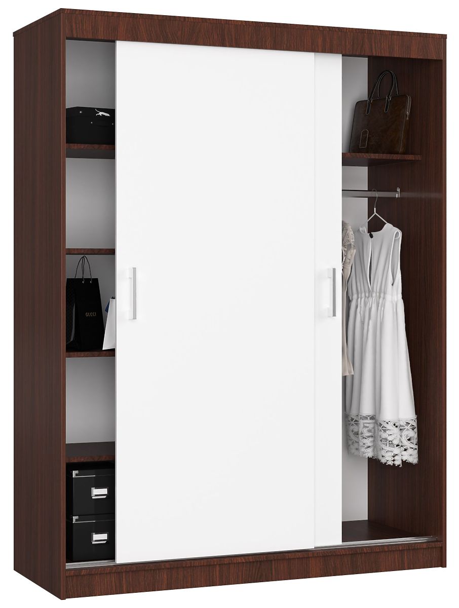 What wardrobes are popular? Those that are spacious and functional, yet aesthetically crafted. These conditions are met by the 150 cm CLP sliding wardrobe in wenge and white from our offer. It is designed for two people. It fits perfectly in the bedroom, living room, or dressing room. It can store not only clothes but also textiles. It is a spacious piece of furniture that helps maintain order in the room.