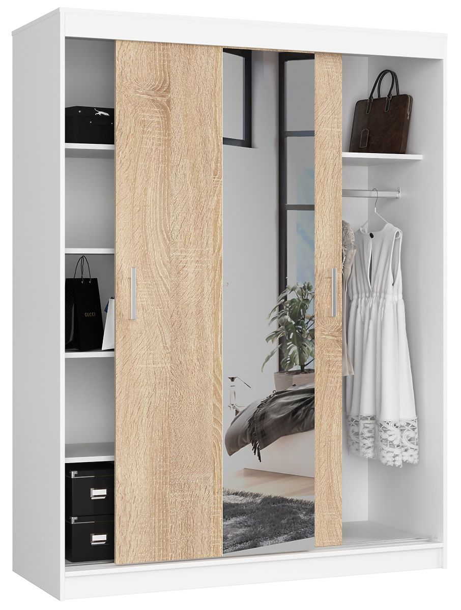 The 150 cm CLP sliding wardrobe in Sonoma shade allows us to ensure the necessary space in our bedroom or dressing room, which we can use for storing various items, not only clothes but also, for example, spare pillowcases. How we use this furniture depends on our individual needs. The wardrobe is equipped with a very practical and useful feature in the form of a mirror, which allows us to check if the chosen style is right. The furniture can also be successfully placed in the hallway, living room, or student room. The space available with this product is sufficient for two people.
