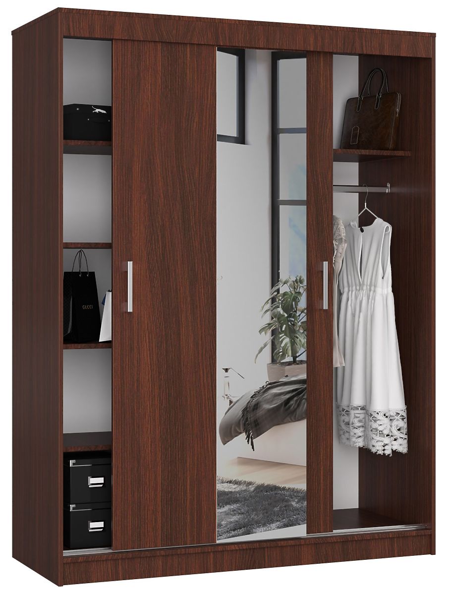 Sliding wardrobe in wenge color with a length of 150 cm, featuring shelves and a clothing rod. Offers a large usable area.