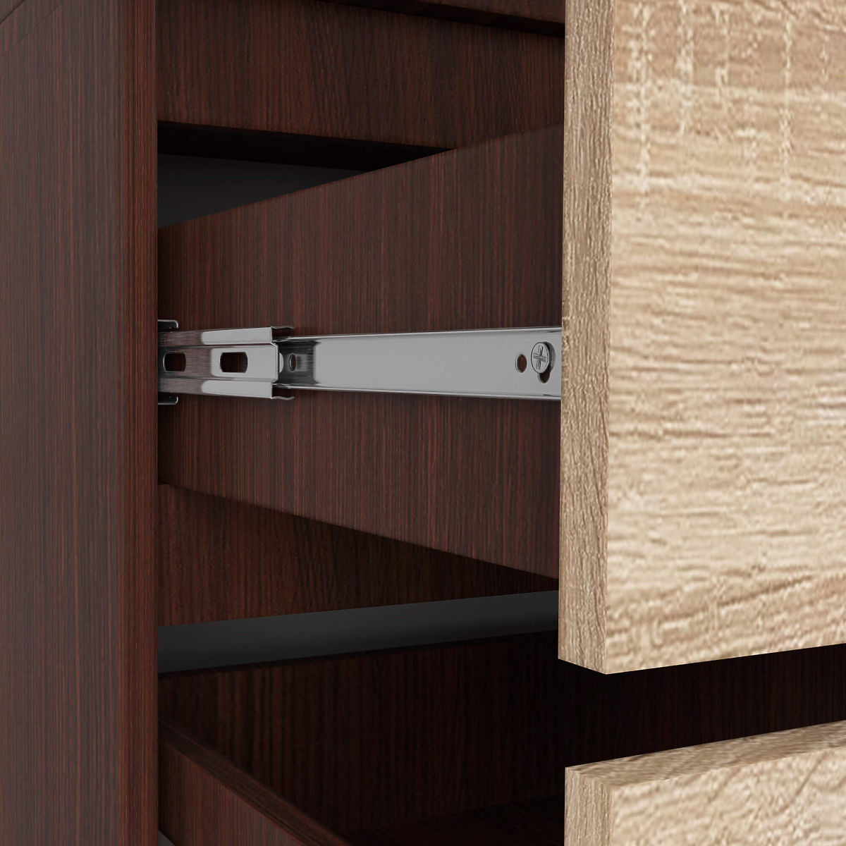 The featured wardrobes combine functionality and modern design. Made from high-quality laminated boards, they exhibit increased resistance to abrasion and other mechanical damages. The edges of the wardrobes, being the most exposed to damage, have been additionally reinforced with ABS edging. This ensures that the furniture maintains its perfect appearance throughout its use. The combination of two color motifs – dark, deep wenge and light, cool sonoma – creates a very original and modern design.