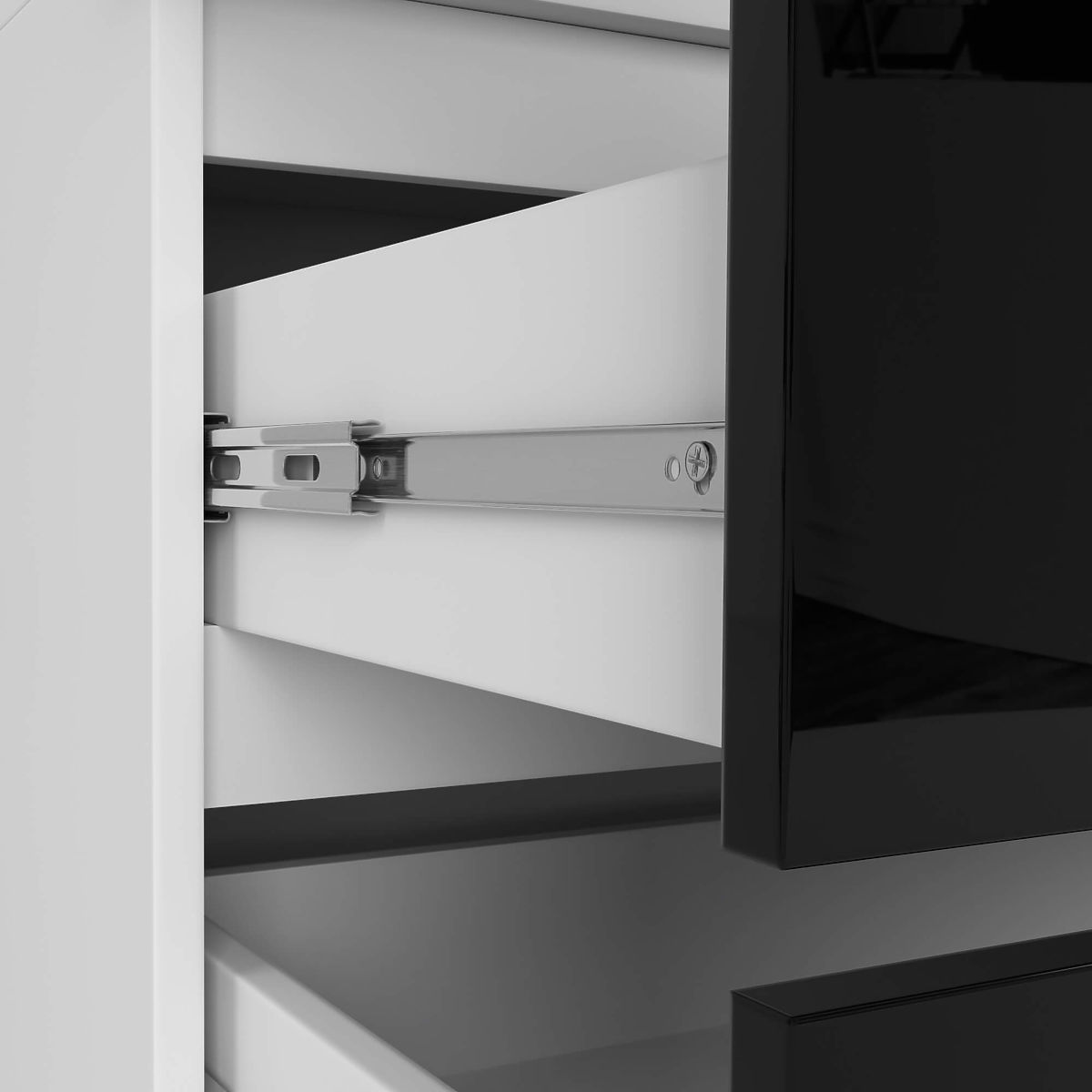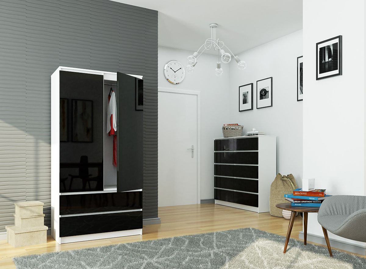 The furniture is characterized by a relatively simple construction, yet it is highly functional. The upper part consists of four shelves and a space for hanging clothes with a specially mounted rod, while the lower part has two drawers on GTV metal ball guides. These solutions make the wardrobe – although it appears light – extremely spacious. In the presented model, the combination of two contrasting color variants – deep black and raw white – gives the entire set elegance and a modern look, further emphasized by the use of a high-gloss finish.