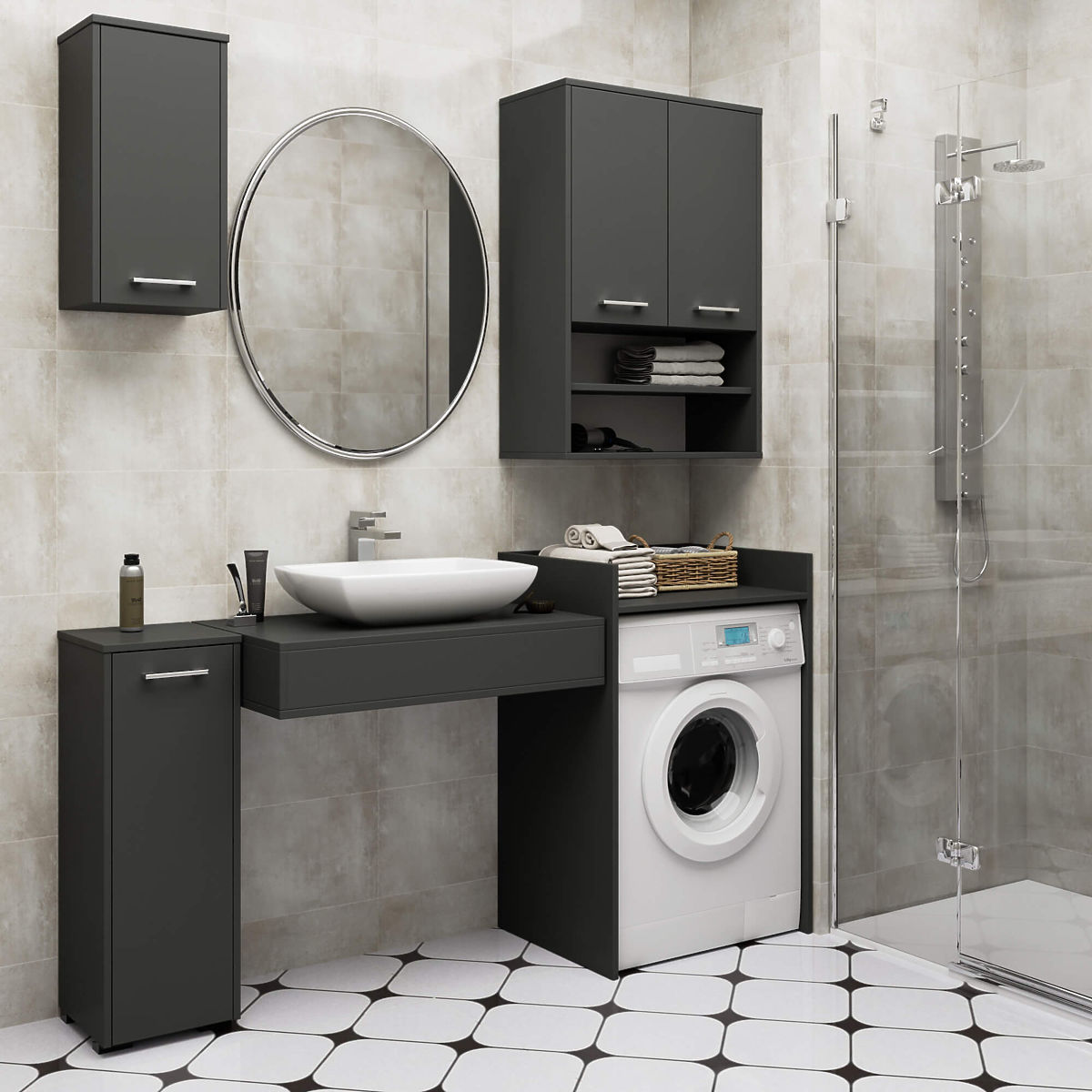 If we want our bathroom to be furnished comfortably and stylishly, we should opt for sturdy and functional furniture. Such is certainly the cabinet above the washing machine. It is an ideal way to utilize the space above the washing machine, which usually remains unused. The optimal dimensions of this column also mean it is a great solution for bathrooms with limited space. Its ergonomic shape allows it to be used in any room. The beautiful shade of graphite gray guarantees an elegant look for the bathroom. The laminated board from which this cabinet is made is a high-quality material. It ensures the durability and strength of the furniture, as well as maintaining its aesthetic appearance.