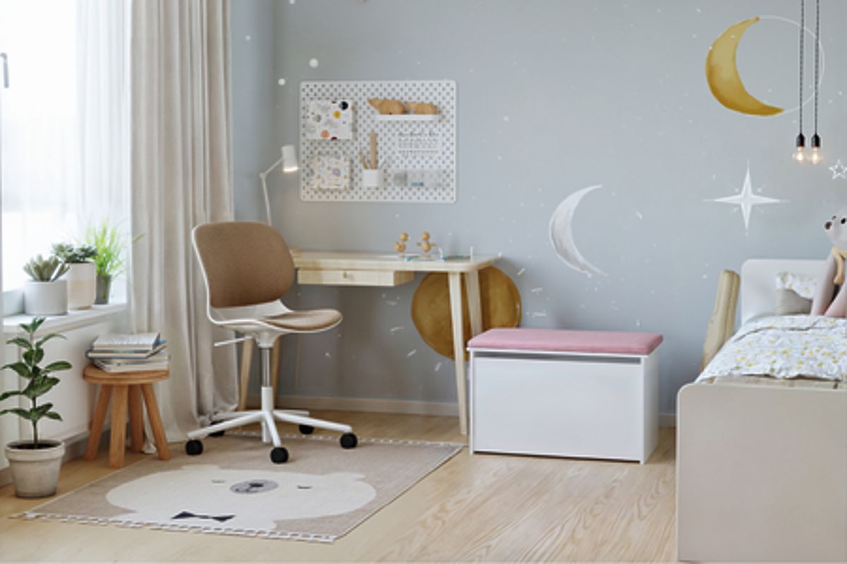 The DARIA chest combines spaciousness with an aesthetic appearance, making it an ideal solution for any child's room, but it also fits well in other parts of the house, such as the hallway or bedroom. The upholstered seat, covered with soft material, ensures comfort, allowing the child to sit on it during play or dressing. Thanks to the sturdy gas piston, the chest lid opens smoothly and effortlessly, allowing the child to easily and safely access its contents. The spacious interior allows for the storage of toys, books, and other small items, keeping the room always tidy. Thanks to its design and functionality, the DARIA chest becomes not only a practical element but also an aesthetic accent in the child's room.