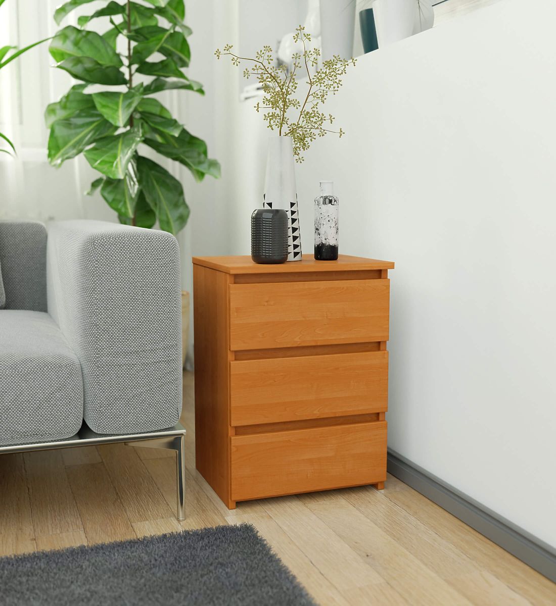 Alder-colored dresser with three drawers and smooth metal slides. .. more