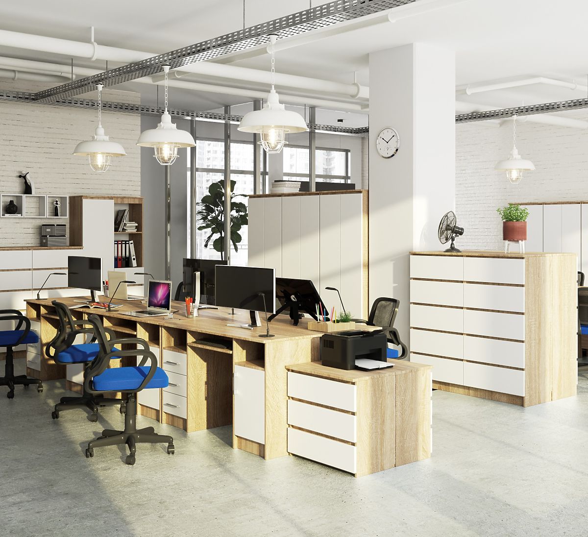 The ANA computer desk is made from abrasion-resistant laminated furniture board in two colors. The desk's body is made of laminate in oak sonoma color, while the drawer fronts and doors are white. Functionally, the furniture is divided into 3 parts. The outer parts consist of cabinets, while the central part is designated for work. Under the top in the central part is a pull-out keyboard shelf, while each outer part has one open shelf. Below the shelf on the left side of the furniture, there are 3 drawers placed one above the other, while on the right is a cabinet with a drop-down door containing 2 shelves.