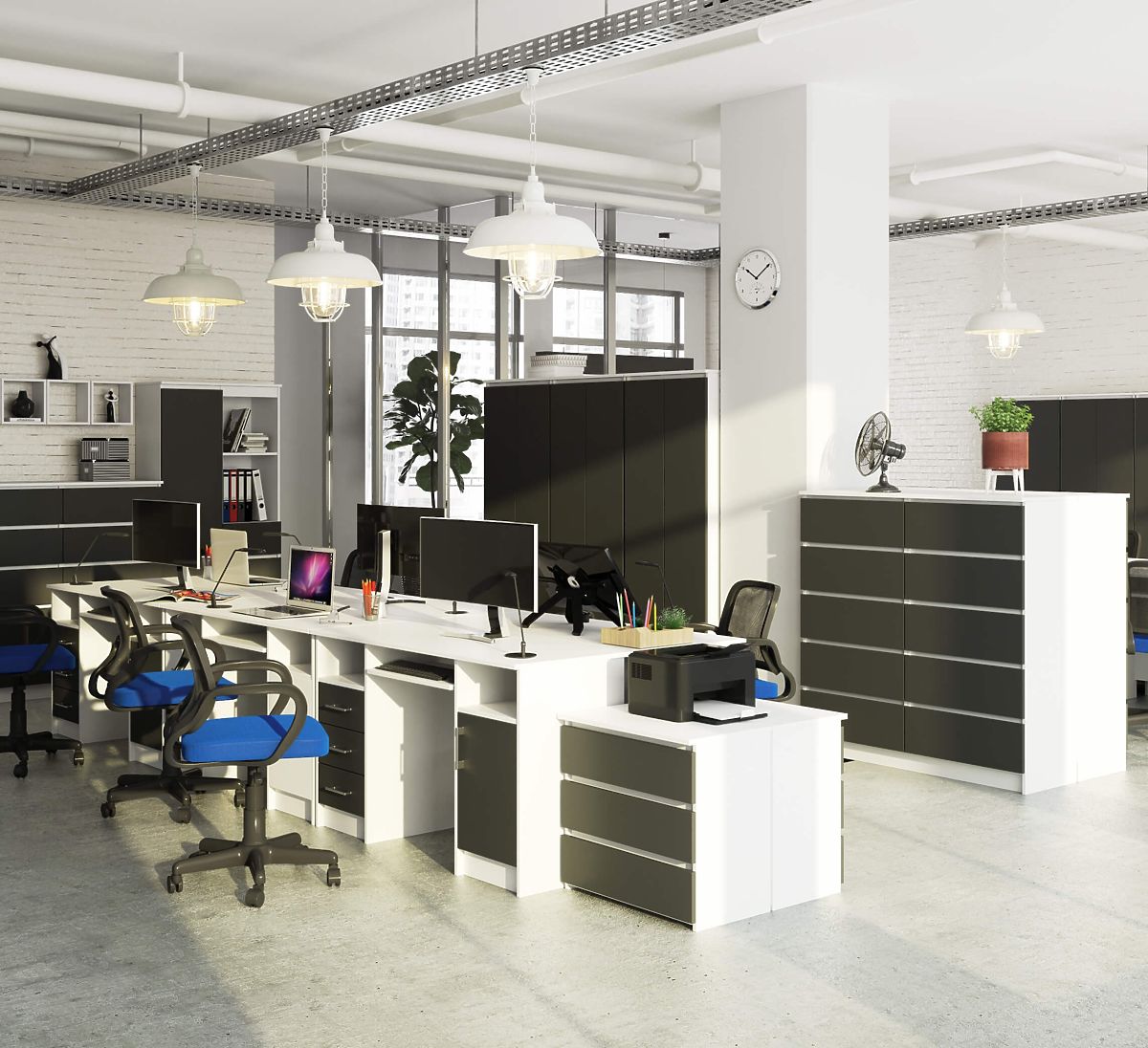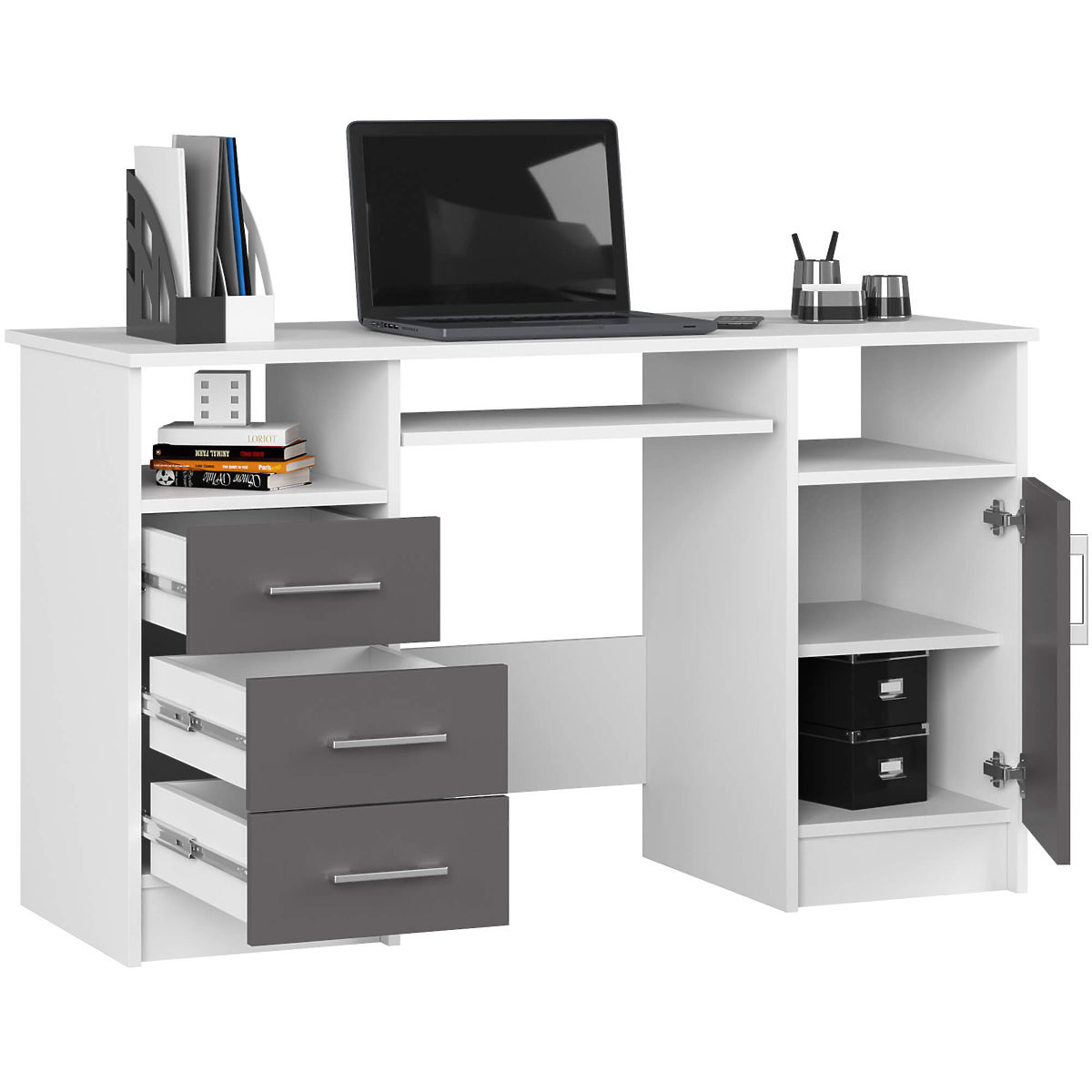 The ANA 124 cm computer desk, with its classic combination of white and graphite gray, easily fits into any interior. It was designed with office spaces and studies in mind. It is also suitable for a teenager's room. The desk surface offers plenty of space – you can place a monitor and other necessary work items as needed. There is a separate pull-out shelf for the keyboard. The desk provides ample space for any arrangement: two niches, three drawers, and a cabinet with a shelf. The entire structure is made of laminated board, which is easy to maintain and abrasion-resistant. The ANA desk is elegance, functionality, and solidity in one.