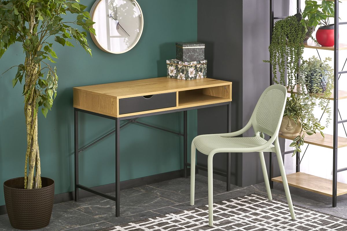 Desk B-50 is an ideal choice for schoolchildren, students, and home workspaces. With its simple yet modern design in golden oak decor complemented by black metal legs, it easily fits into any interior—from a student room to a home office. The desk offers a practical storage solution with one drawer and an open shelf where you can store notebooks, books, office supplies, or small electronics. The work surface is large enough for a laptop, lamp, and other essentials. The laminate used in the desk's construction is resistant to scratches, dents, and dirt, ensuring long-lasting durability and easy maintenance.