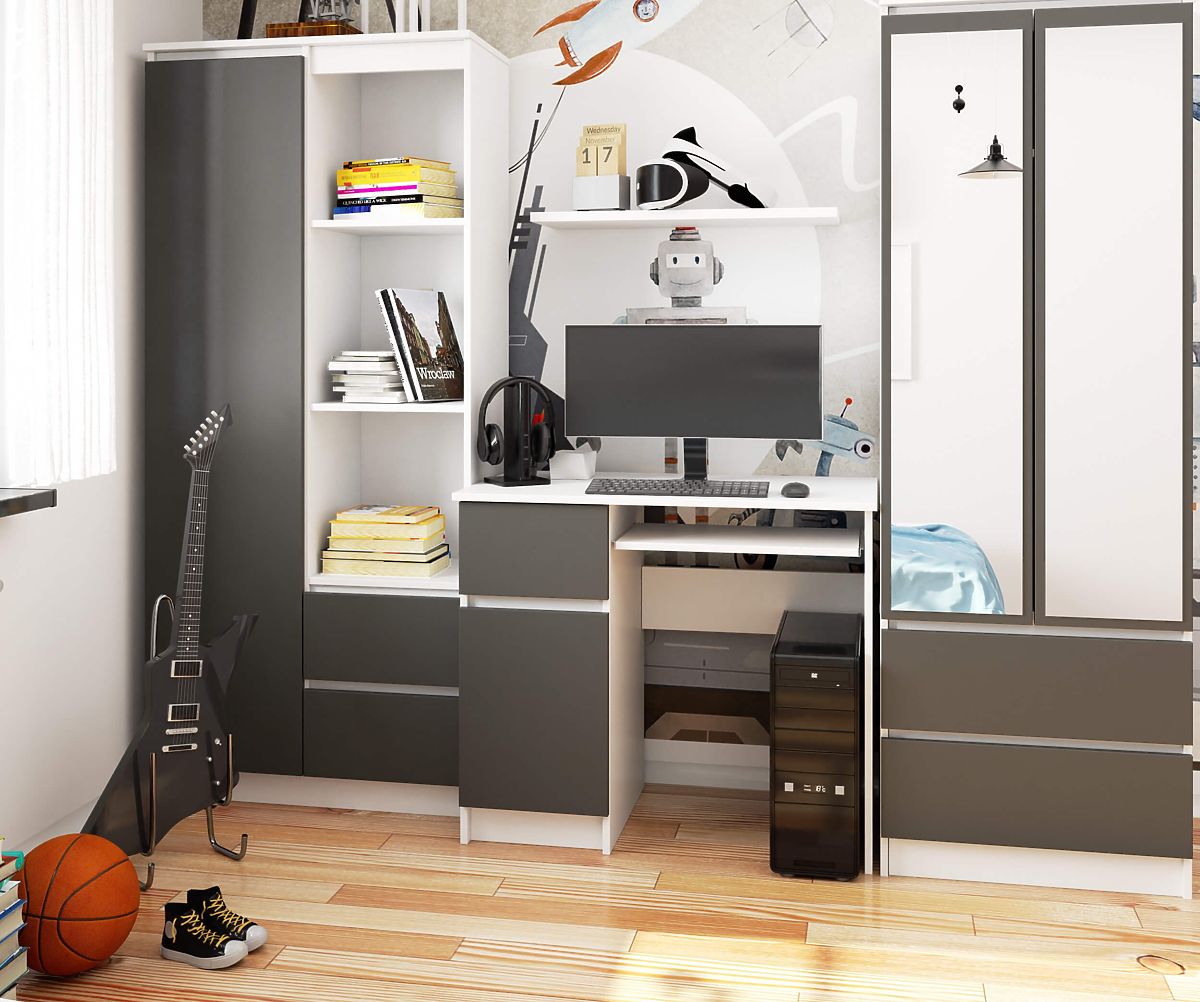 The PIKSEL white/graphite gray computer desk is great for use in a child's or student's room, or in a bedroom or living room where there is a dedicated corner for working from home or studying. It is also suitable for small office spaces, where it fits well with other furniture in a handleless system.