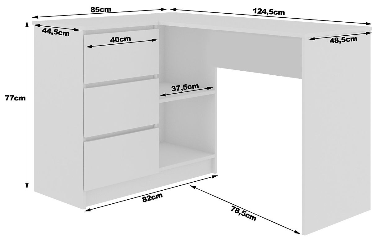 How to choose a desk for a youth room? Primarily based on functionality. A teenager's room must fulfill many diverse functions, providing space for both learning and entertainment. The corner computer desk we are proud to present is a modern solution tailored to the needs of young people. It features a solid construction and high-quality laminated board used in its production. It is durable and scratch-resistant. The easy-to-clean desk also boasts an appealing appearance that will surely attract teenagers. The offer is available at a competitive price. The presented product is perfect not only for a youth room but also for a children's room or home office. It can also be used in an office, where it impresses with its practical use, ample space for individual arrangement, and universal and timeless design. We invite you to purchase.