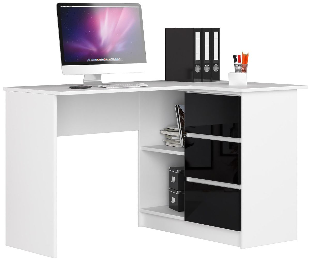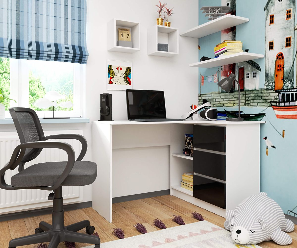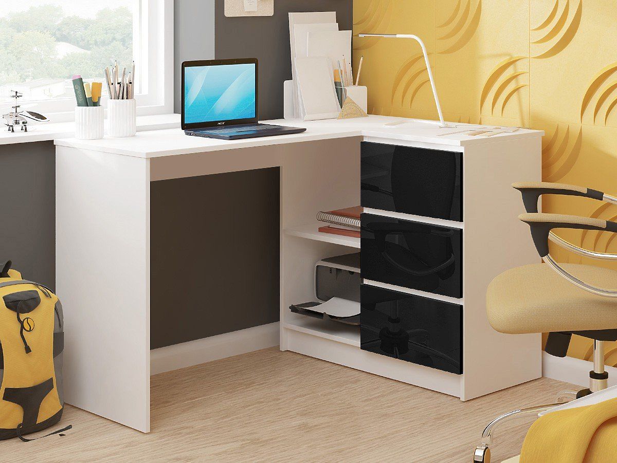 Banaby.ie   »   Children's furniture   /   Children's desks   /   Children's desks   /   CORNER DESK B16 124 cm RIGHT 3 DRAWERS WHITE / BLACK GLOSS