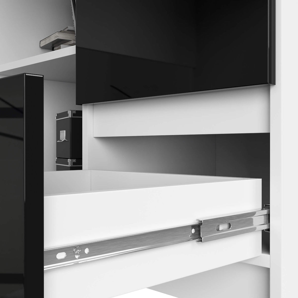 - Drawers move on metal roller guides