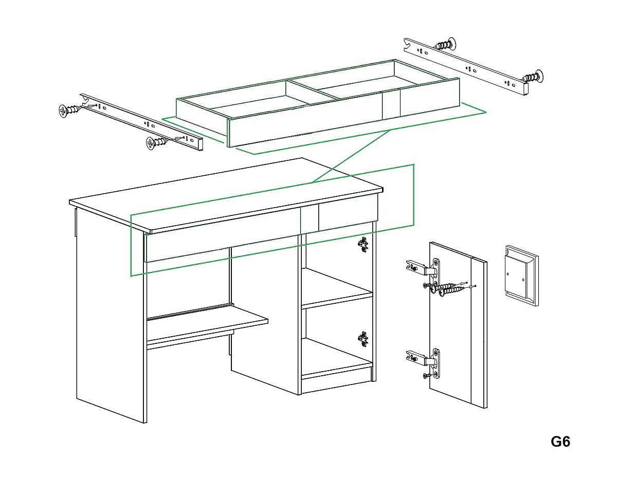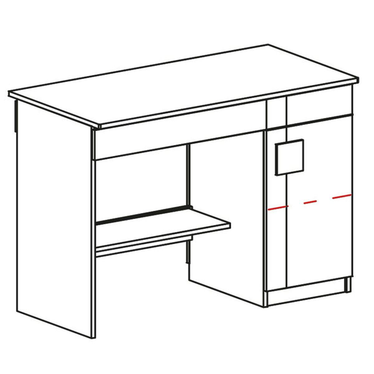 Additional storage space is behind the door with a handle. Inside the cabinet, there is one shelf. At the bottom of the desk, there is an airy shelf that children can fill as they see fit.