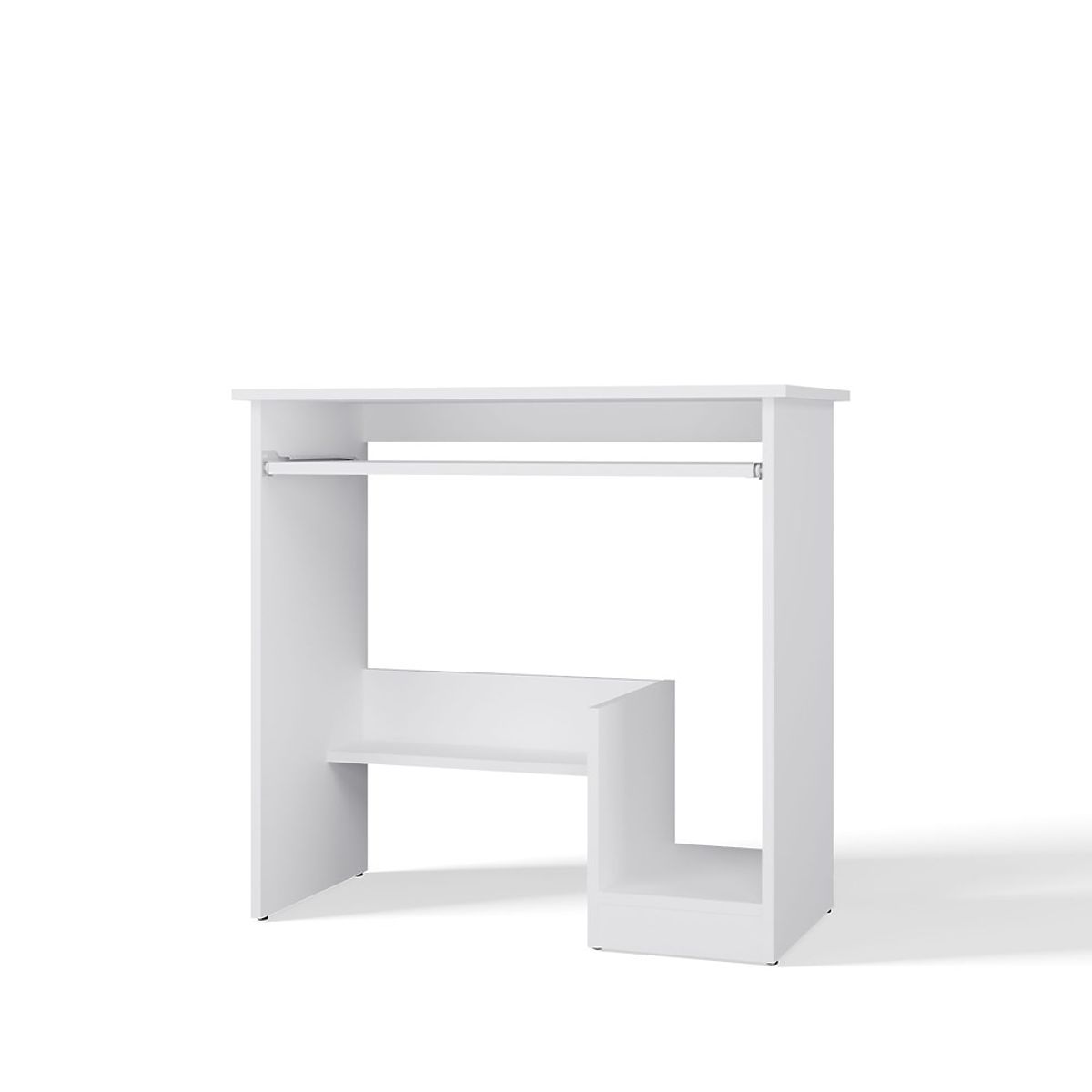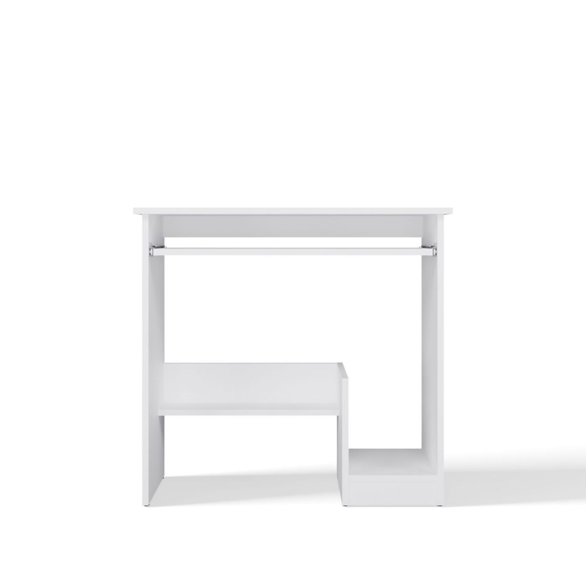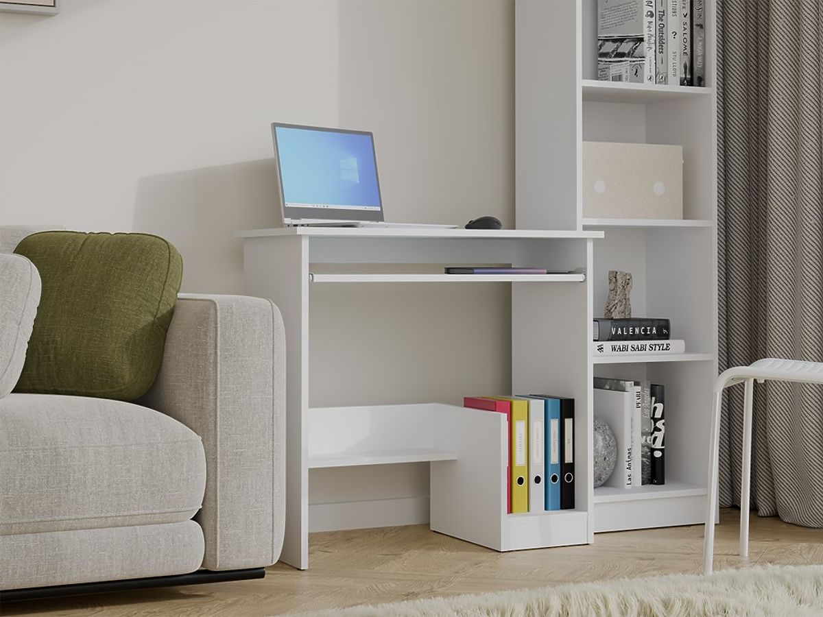 Compact white desk with sliding keyboard shelf and additional storage. .. more