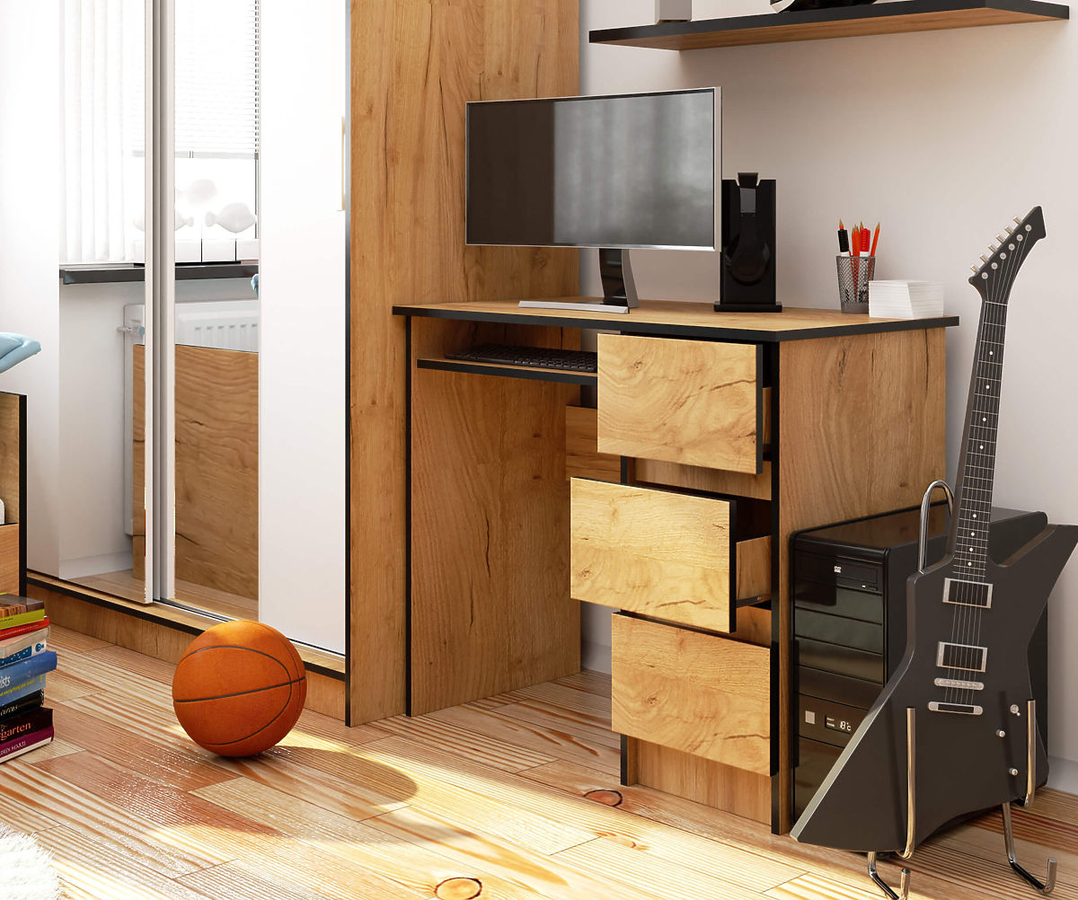 The A-6 90 cm writing desk in craft oak shade, with its universal and timeless appearance and character, fits perfectly into both classic and modern interiors of children's or youth rooms. It can also be successfully used as part of a home office setup. Everything depends on individual needs and preferences. Thanks to the desk being equipped with 3 practical drawers, we gain additional space for organizing and storing various items we want to have at hand.