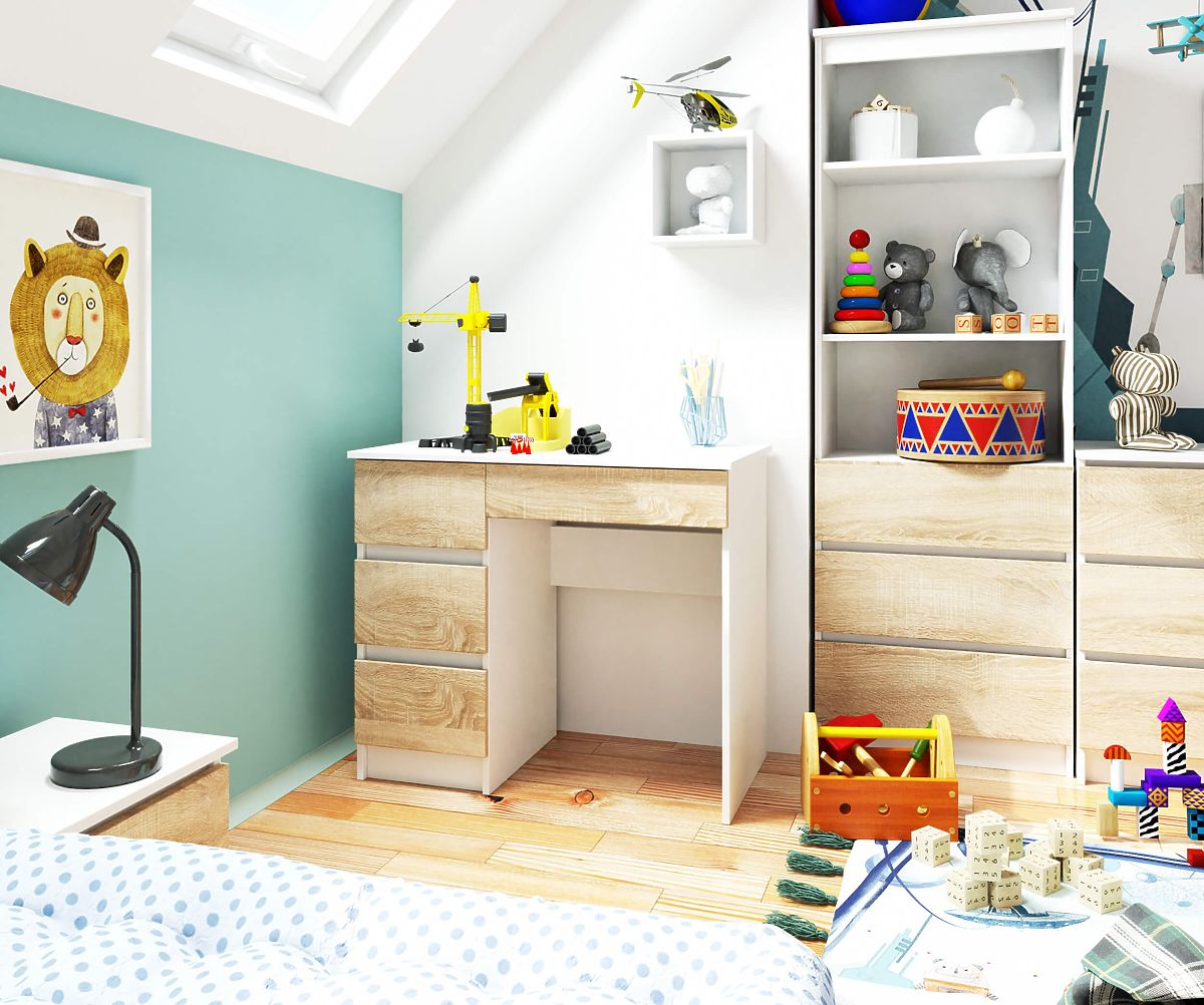 What computer desks are most frequently purchased? Primarily functional, sturdy, and aesthetic ones. This is exactly the model from our offer: the A-7 90 cm LEFT computer desk with a white body and drawer fronts in Sonoma color. The furniture facilitates learning and working in front of a computer screen, ensuring maximum comfort. It is perfectly suited for the living room, children's room, and office.