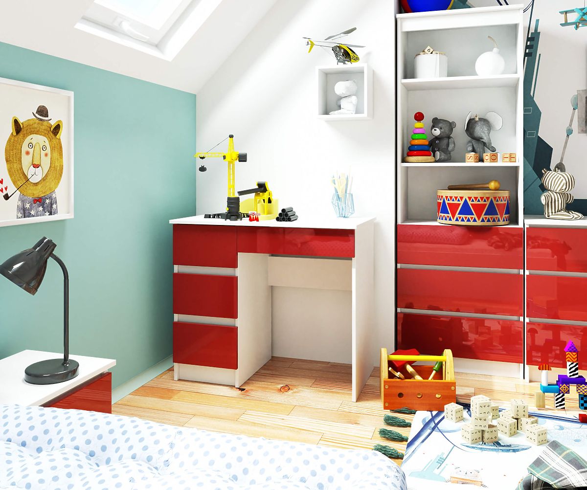 The unusual color of the desk attracts attention, and its functionality ensures that this product meets the expectations of even the most demanding users. The furniture combines a white body with striking red glossy front surfaces, making the desk exceptional. It is a suitable choice for small spaces due to its compact dimensions. The A-7 90 cm (left) computer desk consists of four drawers. It is primarily useful in children's and youth rooms, but also in modernly furnished offices.