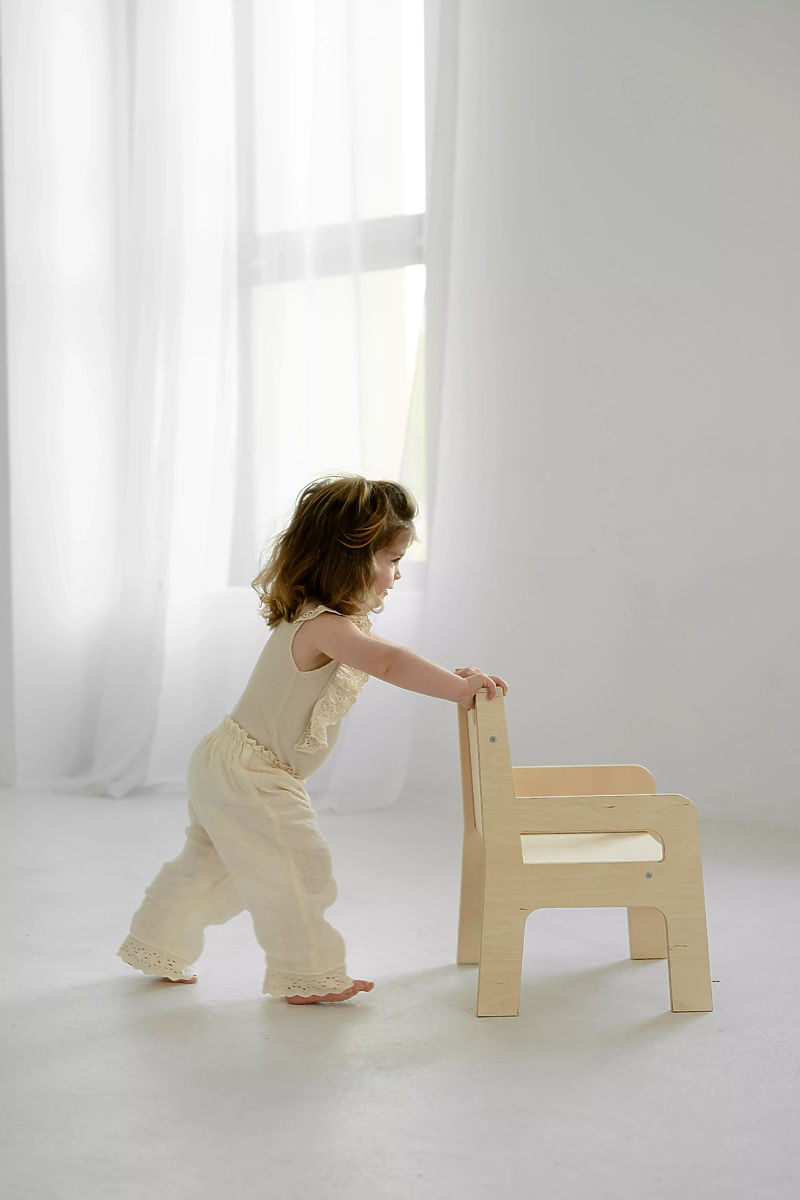 Wooden children's chair is designed for children of various ages – it serves both a one-year-old child discovering the world and an older, creative preschooler. It provides firm back support and ensures comfortable seating for playing, drawing, or dining. It is also great for use in the kitchen or bathroom – a child can stand on the seat and easily reach the countertop or sink. All edges are carefully rounded to ensure maximum safety for young users.