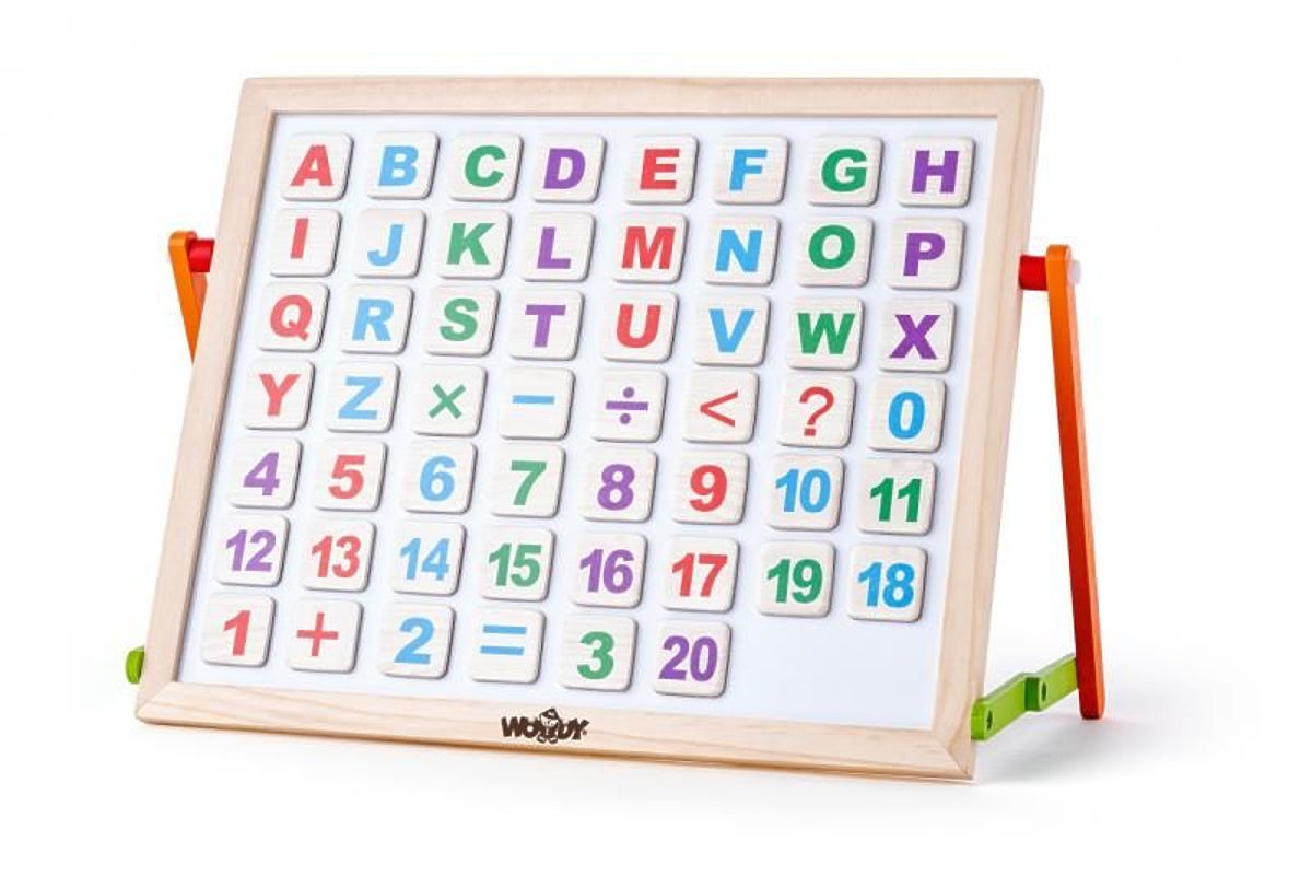 Another phenomenal product from WoodyLand. The amazing magnetic and chalk board is a product that combines extraordinary fun with practical learning. On one side, a child can create beautiful pictures, and on the other, they can form their own sequences of letters or numbers. One part of the toy is a board for writing and drawing with chalk, while the other part is a magnetic board where magnetic letters, numbers, and symbols, which are also part of the set, can be attached. You can write on it with a special dry-erase marker that can be erased at any time. The board has a sturdy stand, allowing you to place it anywhere, such as on the floor or on a table.