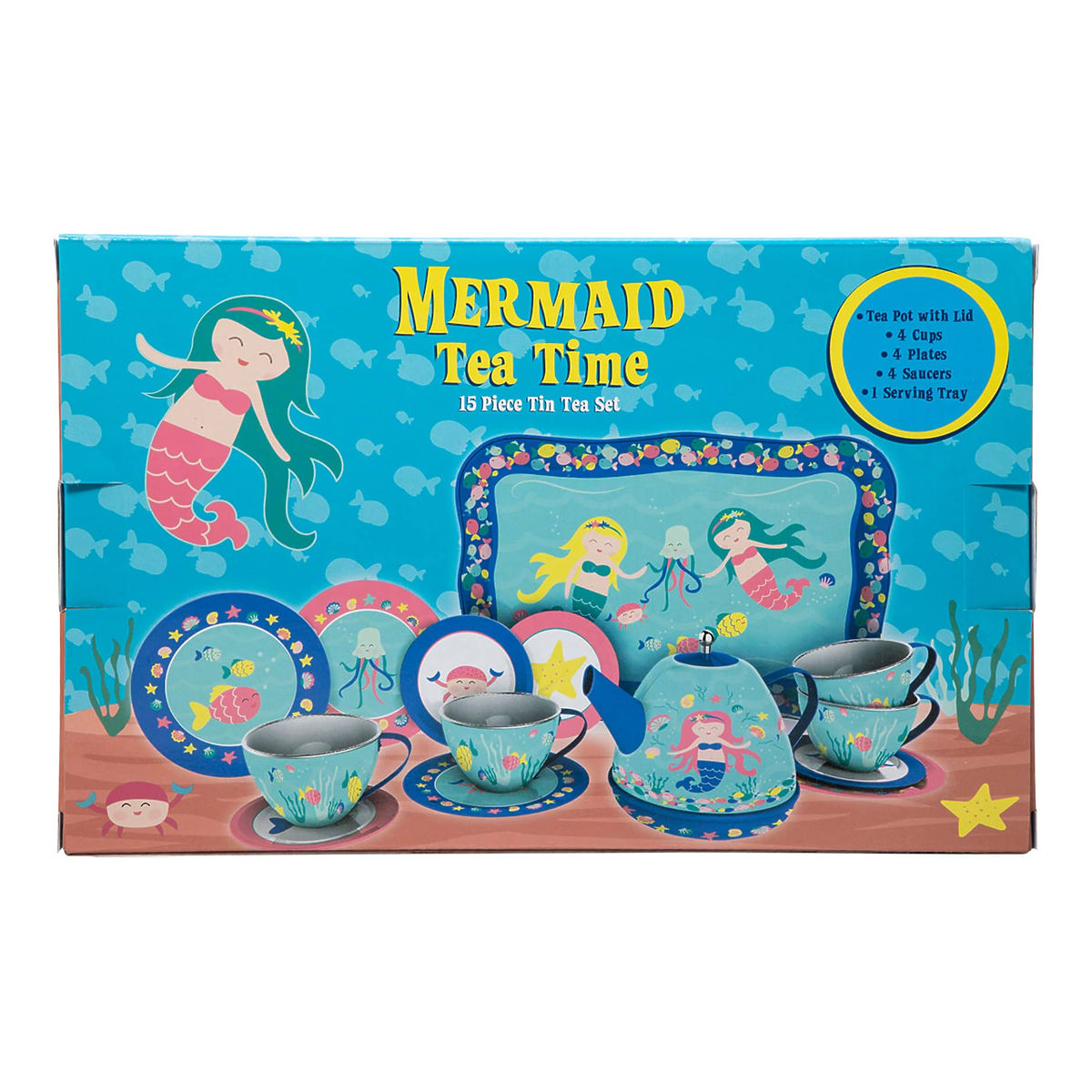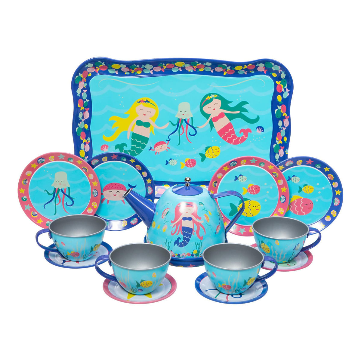 It's tea time. A beautiful 15-piece tea set made of metal, includes 4 cups with saucers, 4 dessert plates, a teapot with a lid, and a serving tray, all in a mermaid design. Creativity rises as your little ones host friends, dolls, and stuffed animals with this beautiful tea set. Suitable for young hosts and hostesses aged 3 and up. Main features: 15-piece tea set, perfect for pretend tea parties, mermaid-themed design.