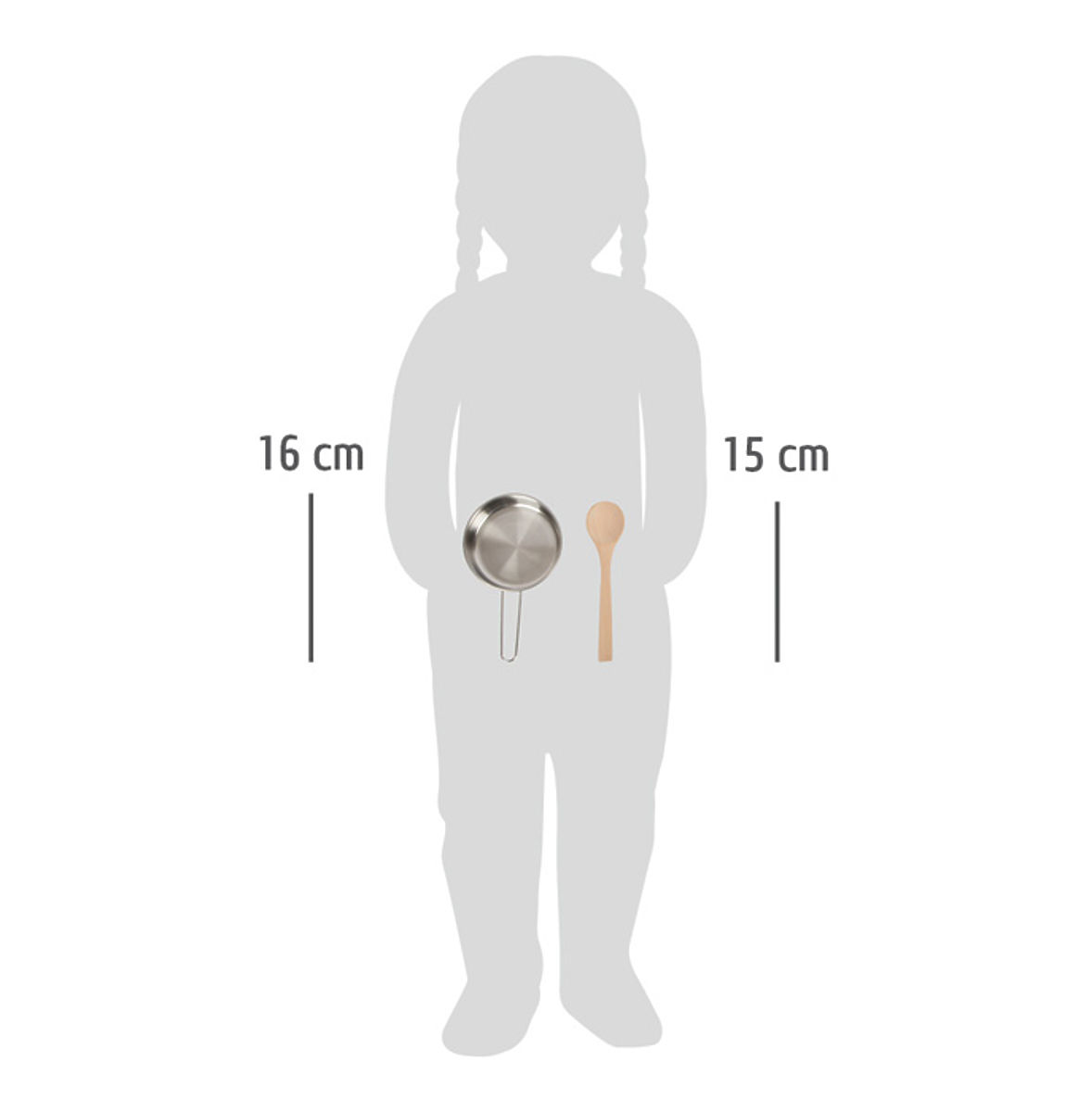 The extensive cooking set consists of a pot with a lid, a pan, a whisk, a spatula, and a wooden spoon. The package also includes a children's apron, a pot holder, and a textile oven mitt. The removable pot lid allows for realistic play. The dishes and kitchen utensils are sized appropriately for children. The apron features a large chest pocket that can hold kitchen utensils. An ideal addition to a children's kitchen. Encourages imaginative role play. Main features: Fashionable design Supports children's imagination