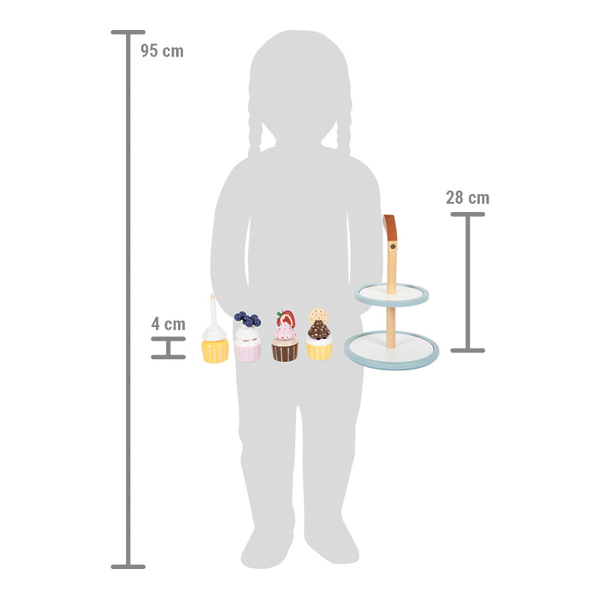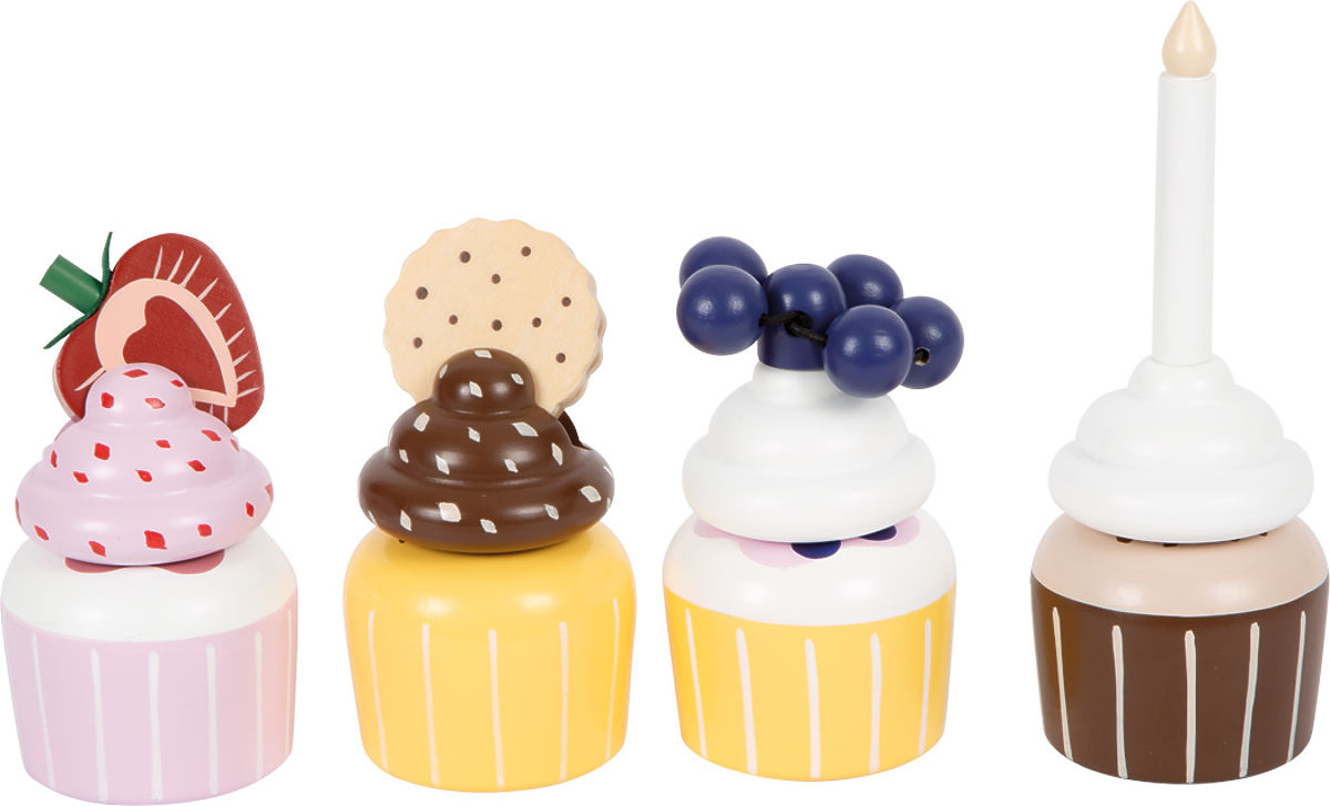 Delicacies for the children's kitchen. This stand with four cupcake holders invites little bakers to actively play and present delicious muffins. The stand has two tiers for displaying sweets in layers. The system of combinable bases and creamy tops allows for a wide range of combinations. The individual pieces are held together by integrated magnets. The set is complemented by a double cookie, a strawberry slice, blueberries, and a birthday candle to decorate the cakes. This encourages the desire for tea with dolls, teddy bears, etc. Who wouldn't have their mouth water at that sight? An ideal addition to the kitchen and grocery store. Details such as the handle made of dark brown faux leather, integrated magnets, and modern, subtle Scandinavian colors make the stand a high-quality and stylish attraction for the children's room. Main features: subtle Scandinavian colors inspire and encourage conversation1 stand, 4 muffins, 4 toppings, 1 candle, 1 cookie, 1 strawberry, 1 blueberry