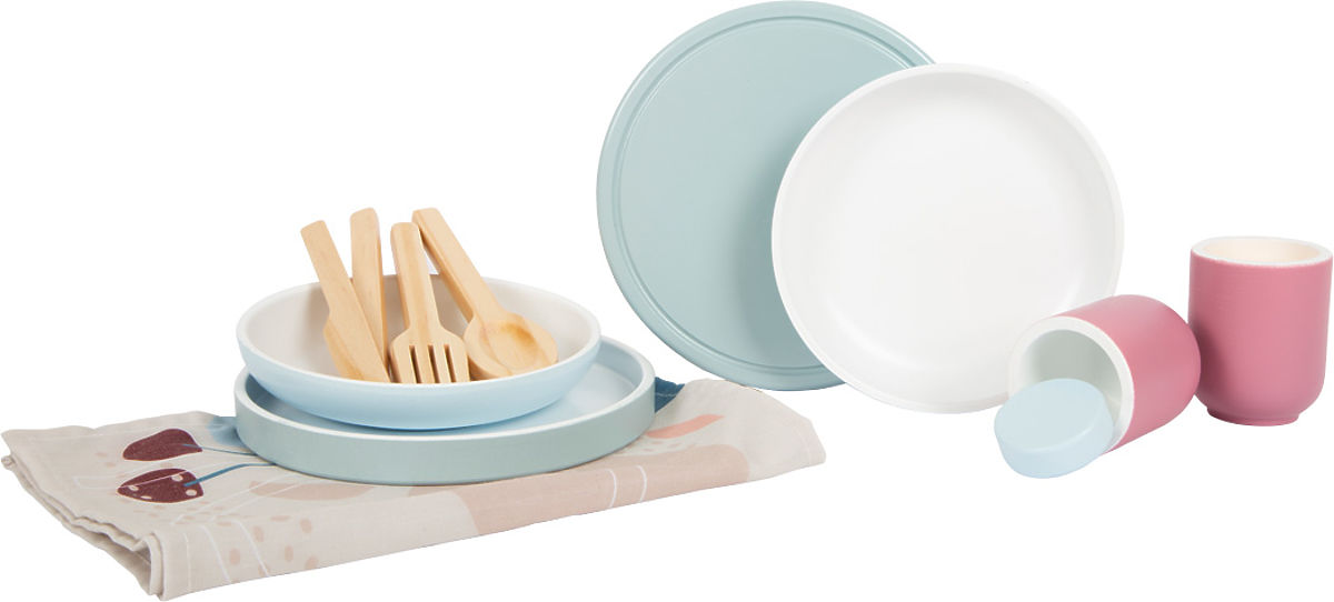 A modern set of tableware including plates, cups, cutlery, and placemats for two people. High-quality craftsmanship made from robust and durable wood, designed to last. Offers additional educational benefits with printed placemats showing how to set the table correctly. Modern look with linear shapes and a combination of natural wood with trendy colors of smoky blue and berry red. Perfect harmony of color and design with the Tasty collection where you can find a children's kitchen and other kitchen products. For especially realistic fun in role-playing in the children's kitchen. Supports the development of fine motor skills, social skills, and other everyday skills. Thanks to its balanced design and modern color scheme, it fits particularly well into modern children's and living room environments. Main features: Supports the development of fine motor skills and social skills Includes 12 pieces