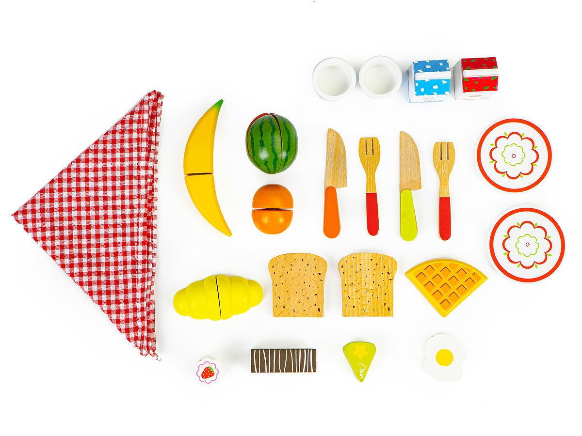 A children's picnic basket with accessories, wooden fruits and vegetables will be a great addition to children's kitchens or shops. With this set, your children will have a lot of fun.