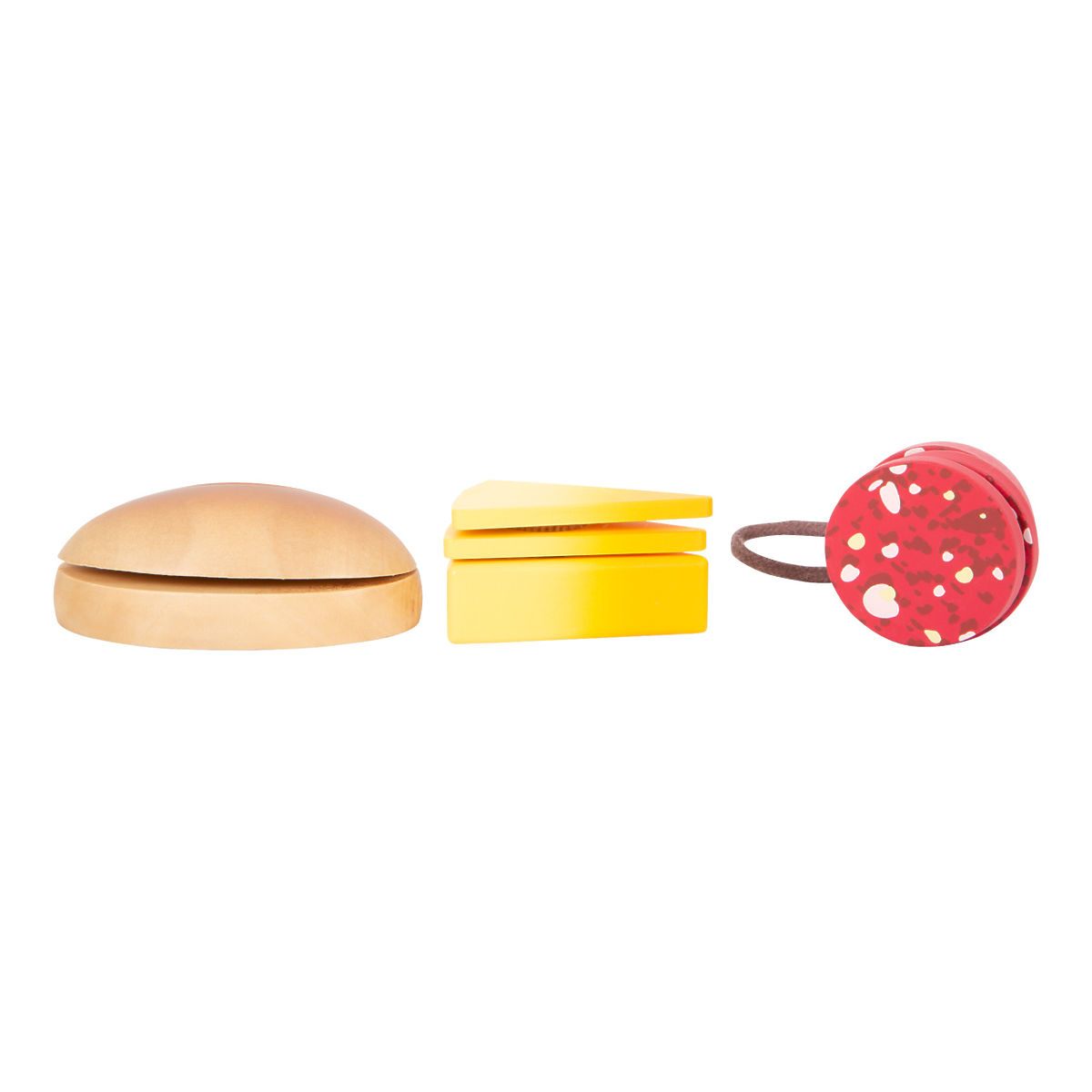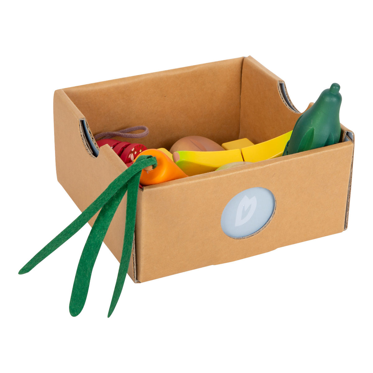 With this set of cutting food made from sturdy wood, children can play as chefs! It consists of common foods that children will easily recognize. The package includes a cutting board, a wooden knife, and a reusable bag that can be used to store the toy. One side of the board can be written on with chalk, so you can jot down a shopping list or recipe. Learning the correct cutting technique is really important, and with this toy, it will be a breeze. Tomato, cucumber, carrot, apple, banana, piece of cheese, salami, butter, and bread – it's all in this set! Naturally looking and detailed foods are held together with Velcro. Thanks to the sustainable packaging, children will learn something new about ecology. The cutting board can be hung up thanks to the loop. Main features: cutting foods made from sturdy wood, Velcro pieces, comprehensive set with board, knife, tomato, cucumber, carrot, apple, banana, piece of cheese, salami, bread, packed in a reusable bag, children learn something new about ecology while playing, one side of the board can be written on with chalk.