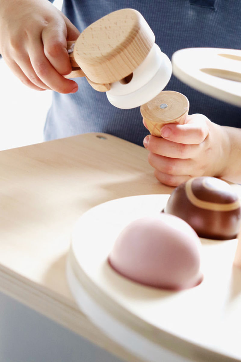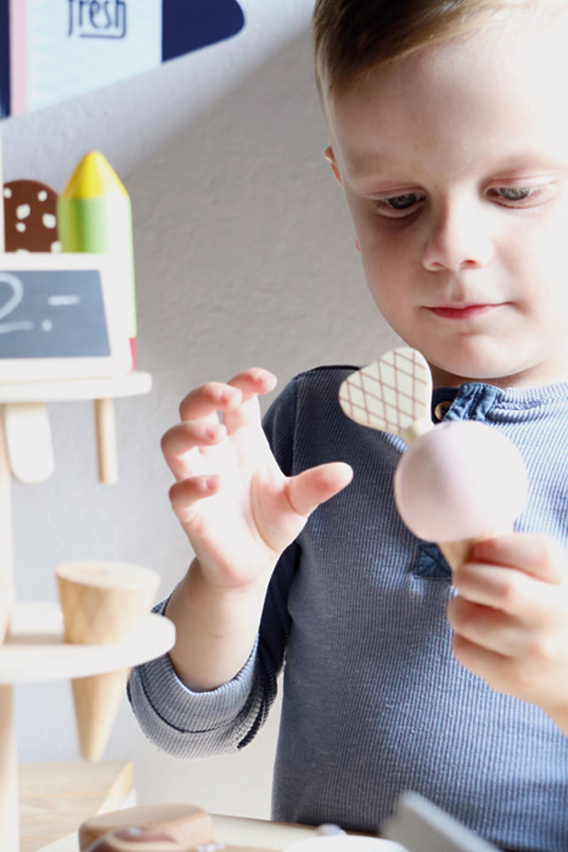 Ice cream scoop with magnetic function. 8 different types of ice cream, from popsicles to delicious scoops. The ice cream scoops are stackable and equipped with magnets. Waffle hearts and portions of whipped cream for decorating ice cream creations. All ice cream parts fit into color-coded spots on the stand. Gender-neutral, understated color scheme with plenty of visible wooden material. Comes with a chalkboard for writing. A perfect addition to the multifunctional store and other play food from the Fresh product line. Main features: Parts are equipped with magnets Everything has its place on the stand Develops children's communication and social skills