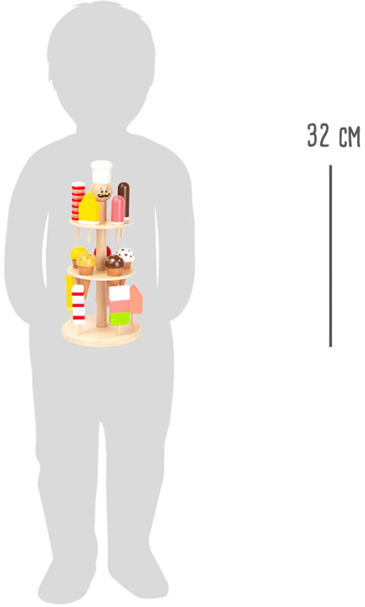 Yum... ice cream! This lovingly designed ice cream stand made of solid wood fulfills all ice cream wishes. Here, children can choose their favorite ice cream. Whether it's popsicles or ice cream in a waffle cone - it's not an easy decision! Different ice cream flavors can be easily placed in the ice cream stand, making them a real eye-catcher on the sales counter in a store or in a children's kitchen or café. Main features: Supports children's social skills and fine motor skills