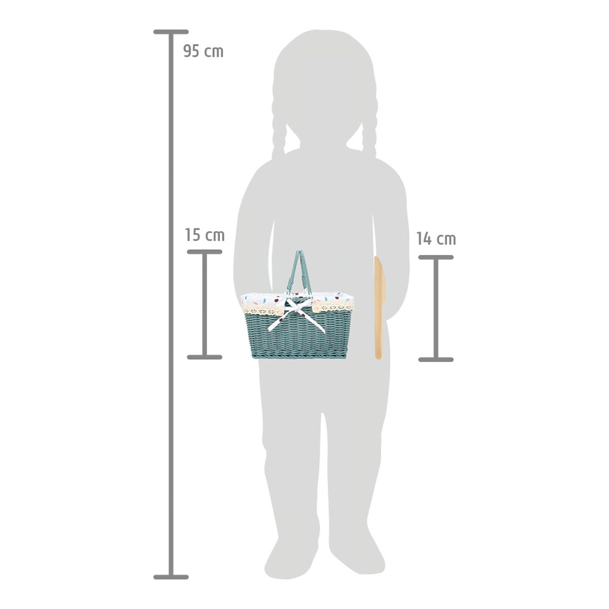 You can go on a picnic! This high-quality picnic basket with foldable handles and a picnic blanket will be a great accessory for your trips to the countryside or garden. The basket is woven from quality wicker and is equipped for 2 people. The dishes and food are made of solid wood. The orange and croissant are held together with Velcro. The inner lining of the basket can be removed and easily cleaned. This toy matches the color scheme of the "Tasty" kitchen and other products from this series. Children will enjoy imaginative play with it both indoors and outdoors. Some of the foods can be "sliced" with the help of a wooden knife. Main features: modern and robust wicker picnic basket "food" for two people handles can be folded blanket with the same motif included inner lining can be easily removed toy for role-playing in kitchens or picnics helps develop fine motor skills, social and everyday skills modern design combining white, natural wood, and trendy colors compatible with other products from the "Tasty" range