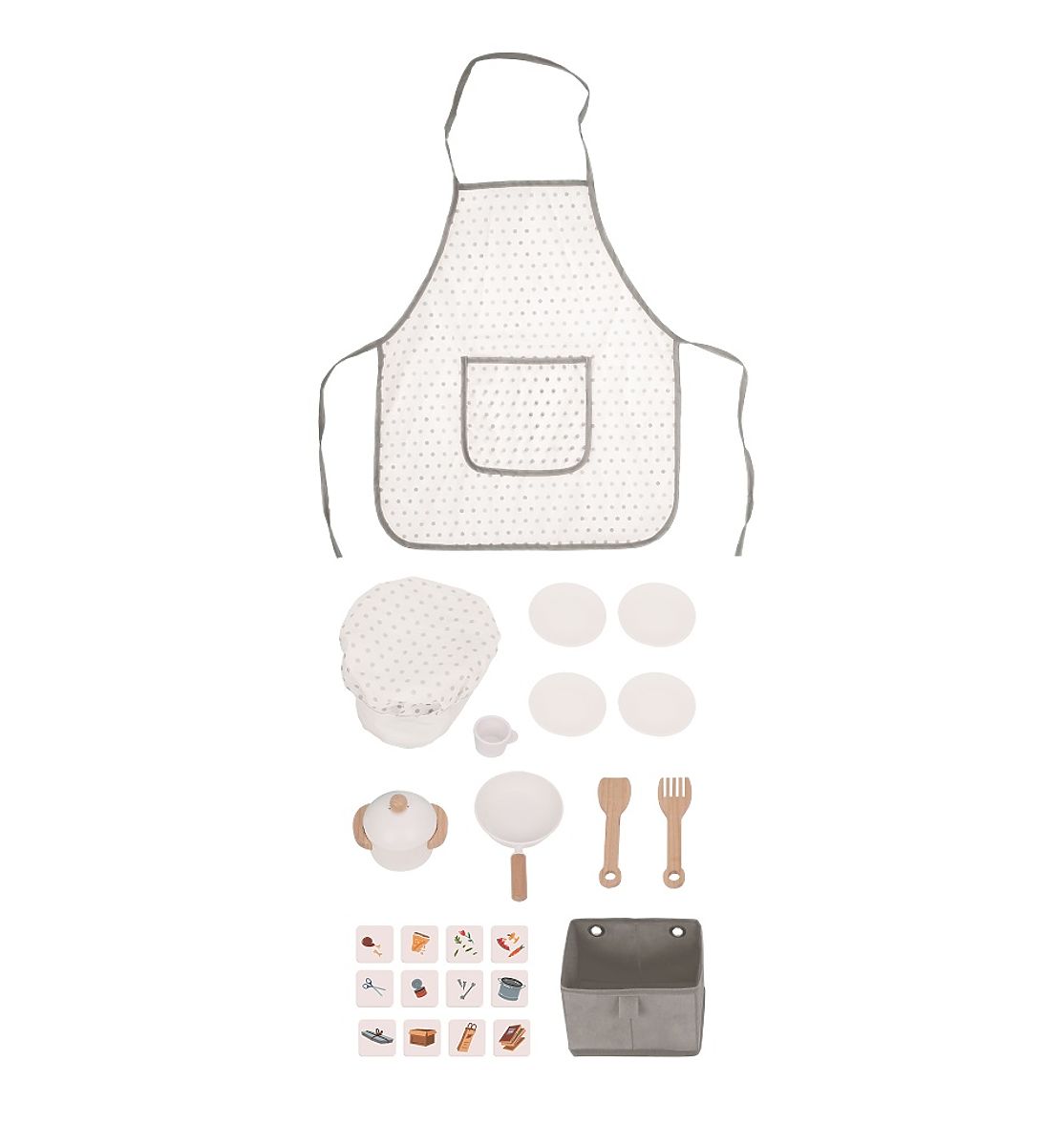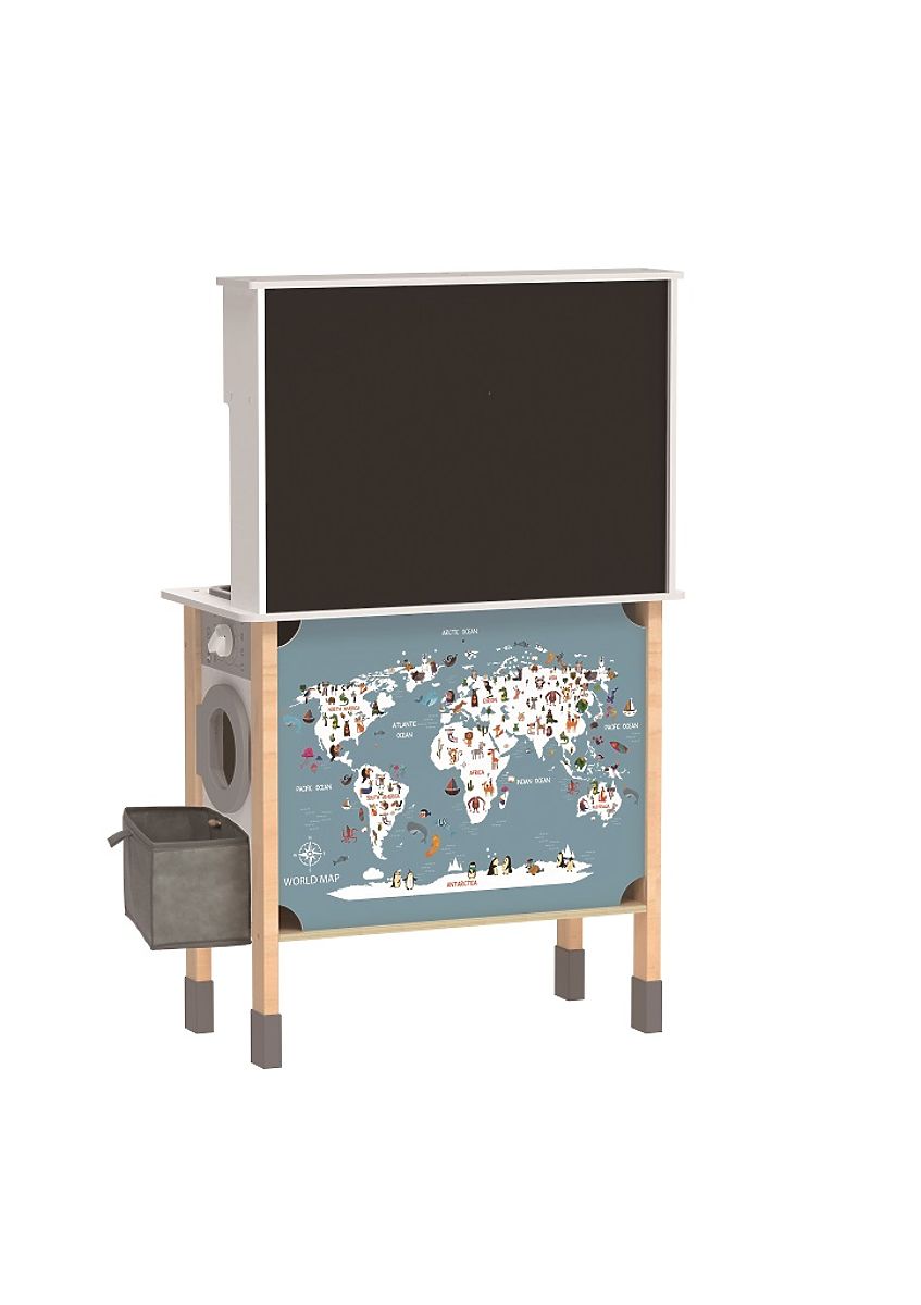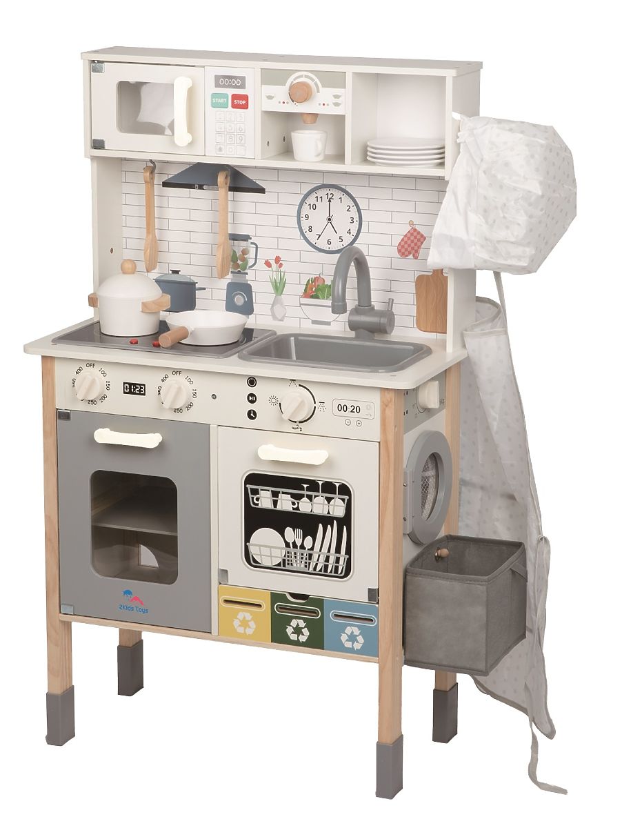 Fancy a fresh pastry straight from the oven? Or perhaps you're craving something fried? With this kitchen, you can have any menu you desire. It is fully equipped! You'll find everything that no modern kitchen should be without - a stove with an oven, a dishwasher, a microwave, a sink, a coffee maker, and of course, dishes and utensils like plates, a pot, a pan, a mug, and more. On the side of the kitchen, there's a washing machine, from which the washed laundry can be placed into a hanging removable basket. Even the back of the kitchen is utilized. On the practical blackboard, children can write messages, list recipe ingredients, or draw something. As inspiration, they might use the fun map with animals, which is also on the back. So put on your chef's hat, wear a practical apron, and start cooking. Since we care about planet Earth, we must not forget the sorting bins! Main features: includes rich accessories, multifunctional, diverse use, develops communication and social skills, made of FSC® certified wood. The FSC® (Forest Stewardship Council) brand and certificate guarantee that the wood from which the product was made was not illegally harvested and comes from forests managed in an environmentally friendly or nature-friendly way, where strict environmental and social requirements are met. The FSC® label on the product means that by purchasing it, you help protect forests and support sustainable, responsible, or nature-friendly management, thanks to which our forests are more stable, healthier, have a natural species composition, and better withstand the negative effects of climate change.