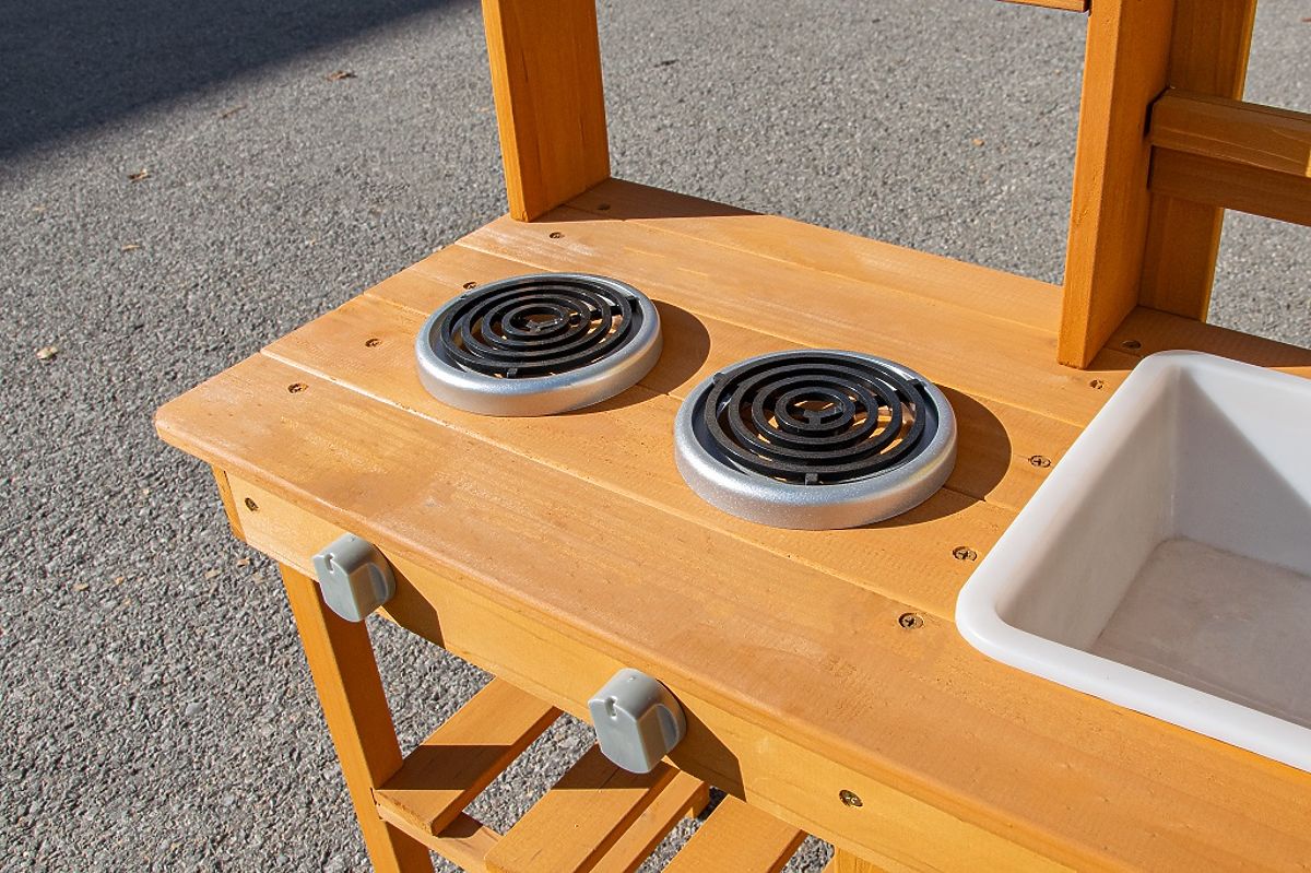 Let children enjoy a snack right under the open sky and embraced by nature. In a place where meals are scented with a fresh breeze and the sun bakes loaves of sand and water, a space for imaginative play is created. This garden kitchen offers a great opportunity to develop children's creativity, independence, and culinary skills while playing in the fresh air. The kitchen is equipped with useful features such as a jug with a tap, a sink, two cooking hobs, and two flower pots. There is also extensive storage space, perfect for storing all accessories. And what's on the menu today? Pure imagination! Main features: compact dimensions, multifunctional and diverse use, spacious storage area.