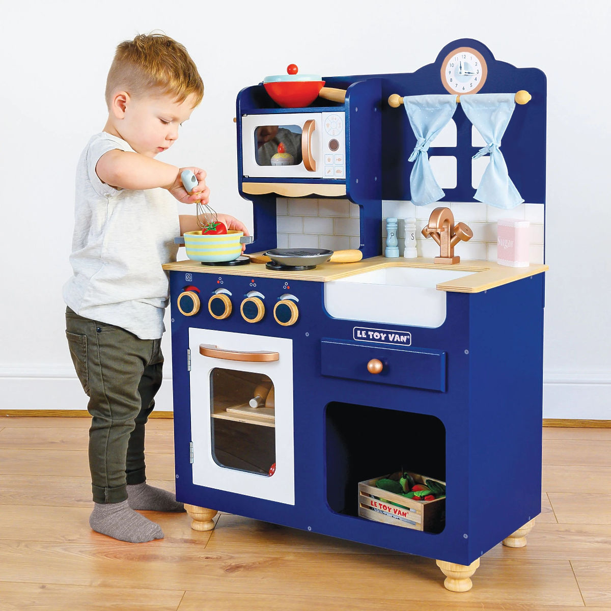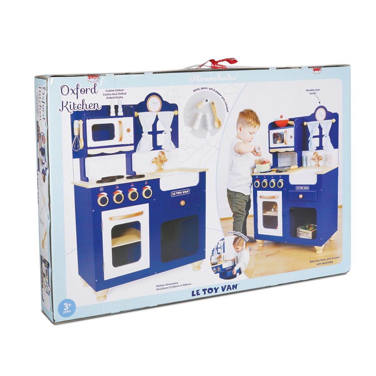 The Oxford Kitchen is made from sturdy and sustainable wood, with an original design that makes it a unique piece. It is painted in a royal blue shade, with copper-colored details. This traditional toy will fit into any child's room, inspiring children to engage in imaginative role play. Its features include an oven with opening doors, turning knobs, a sink, a microwave, a cute window with curtains, and a clock with movable hands. The package also includes a whisk, a spoon, a salt shaker, and a pepper shaker. Everything for little chefs. You can equip the kitchen with food and accessories from the Honeybake collection by Le Toy Van. A beautiful toy that can be passed down from generation to generation. Toys with a purpose: All Le Toy Van toys are made to last. Designed with love by experienced craftsmen using ethical practices and sustainable materials that are kinder to our planet. Main features: wooden kitchen with accessories ethically made from sustainable wood tested to the strictest standards painted with non-toxic water-based paints inspires creative and imaginative play helps develop language and social skills supports early development Honeybake collection: Toys in this collection are suitable for exploration, helping children develop imagination, social and verbal skills, and cognitive functions. Traditional design with modern details will surely entertain children. Honeybake is Le Toy Van's most award-winning collection, recognized for design, quality, safety, and educational and play value.