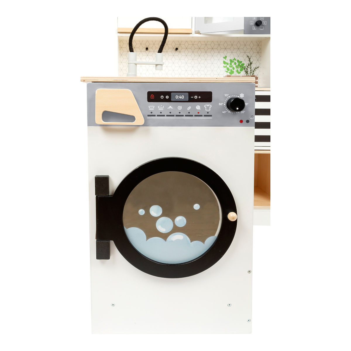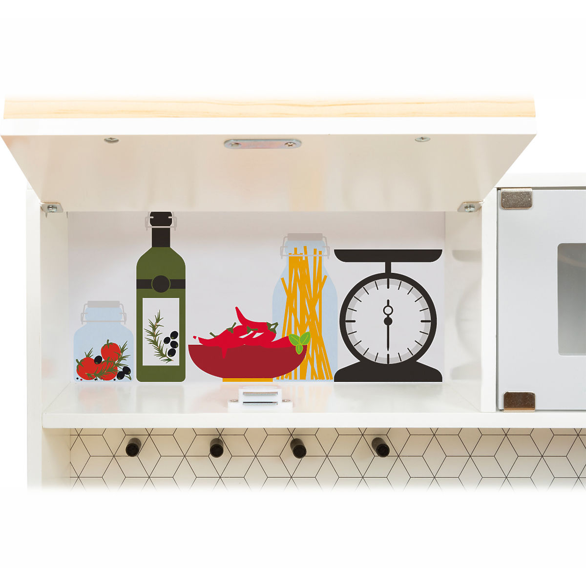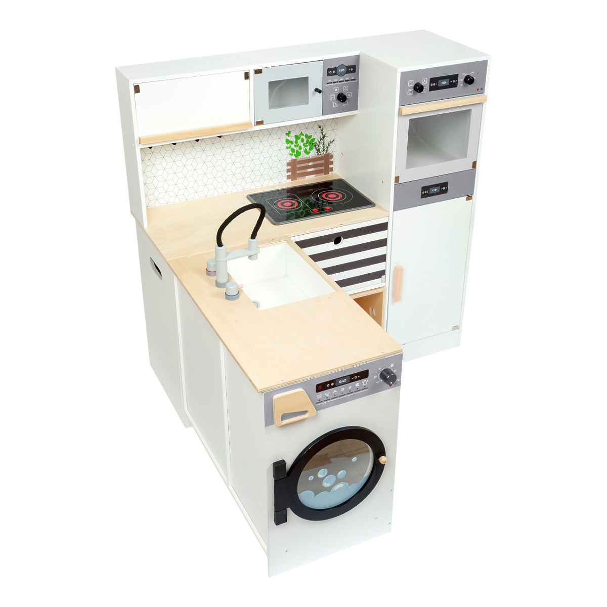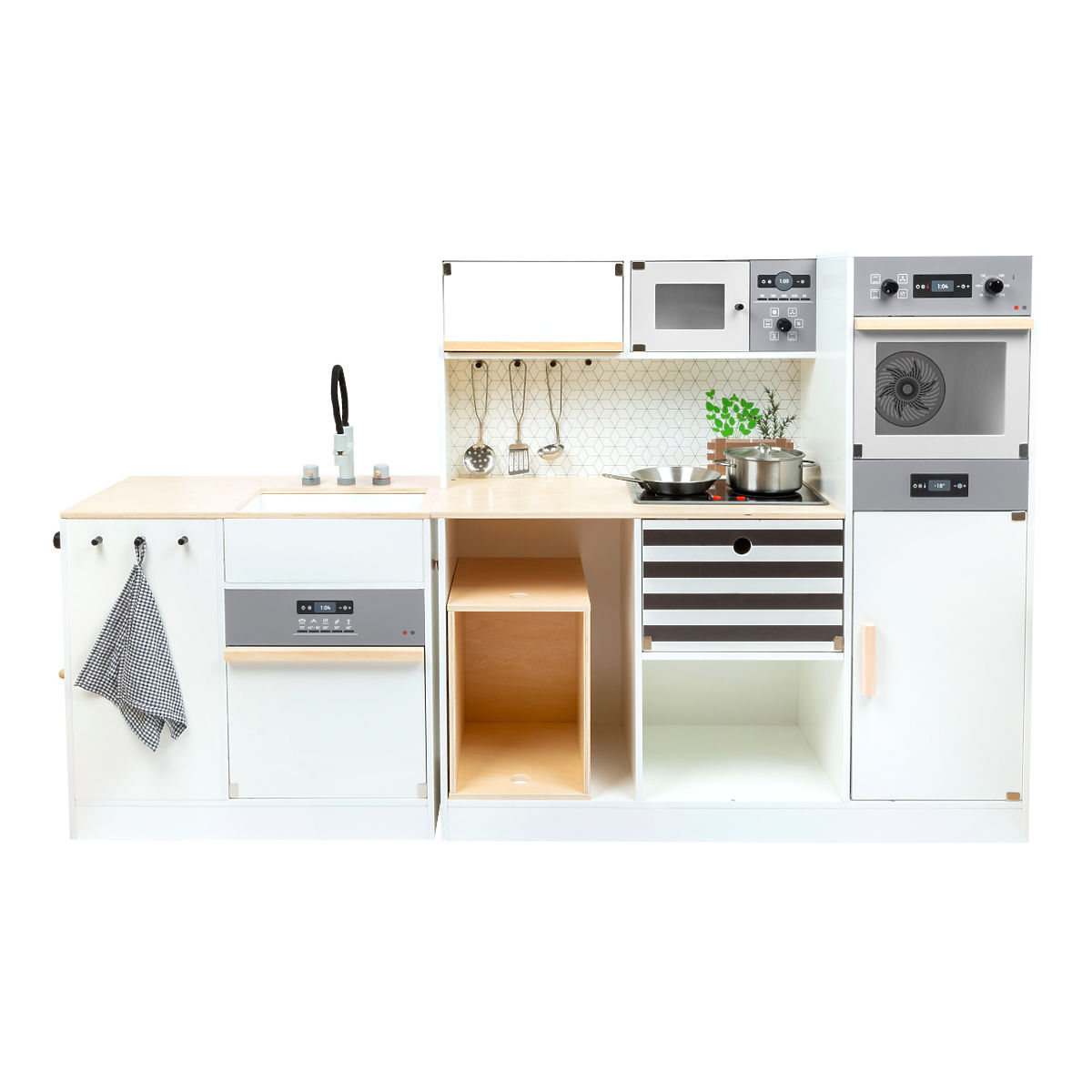 For all chefs and homemakers! This large, fully equipped children's kitchen offers all the appliances of a modern household. Thanks to its modular system, it can be assembled as a corner kitchen or a kitchen unit with a functioning island, providing plenty of space and possibilities for play for multiple children at once. The rotating knobs click, and the stovetop with battery-powered (batteries not included) light and sound ensures realistic play enjoyment. The cabinets provide ample storage space and are equipped with doors. High-quality metal cookware is included. A wide range of additional accessories is also available for the kitchen. The product requires assembly and comes with a pictorial assembly guide. Main features: children's kitchen: stove, oven, microwave, fridge, storage spaces; kitchen island: sink, washing machine, dishwasher; accessories: pot, pan, turntable, spoon, ladle, towel; light and sound effects (batteries not included); multifunctional, diverse use; robust and durable design.