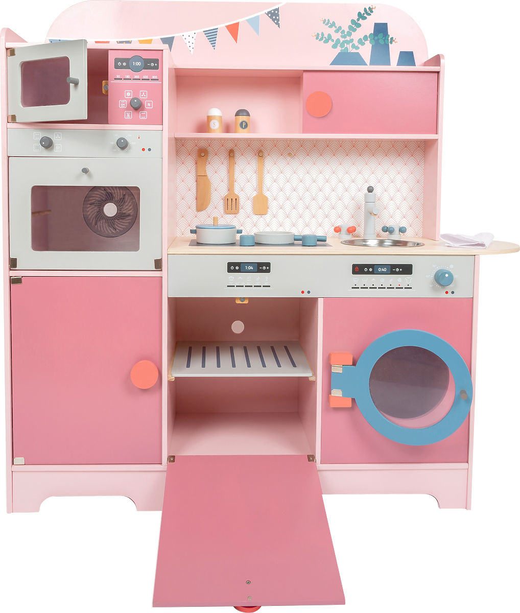 With this kitchen, a Michelin star is yours! This children's wooden kitchen in a modern pink retro design with a stove, sink, washing machine, dishwasher, refrigerator, microwave, and convection oven is perfect for hours of fun. The knobs click and the appliance doors open. It comes with serving cutlery, a pot, a pan, a salt shaker, and a pepper shaker. Key features: numerous appliances, doors with magnetic closures and clicking dials, realistically illustrated appliance control panels, includes a small cooking accessory set, storage space, supports active role play and social skills.