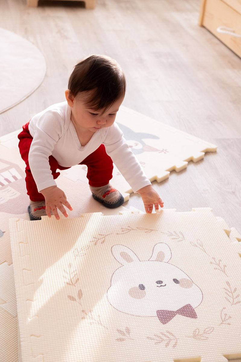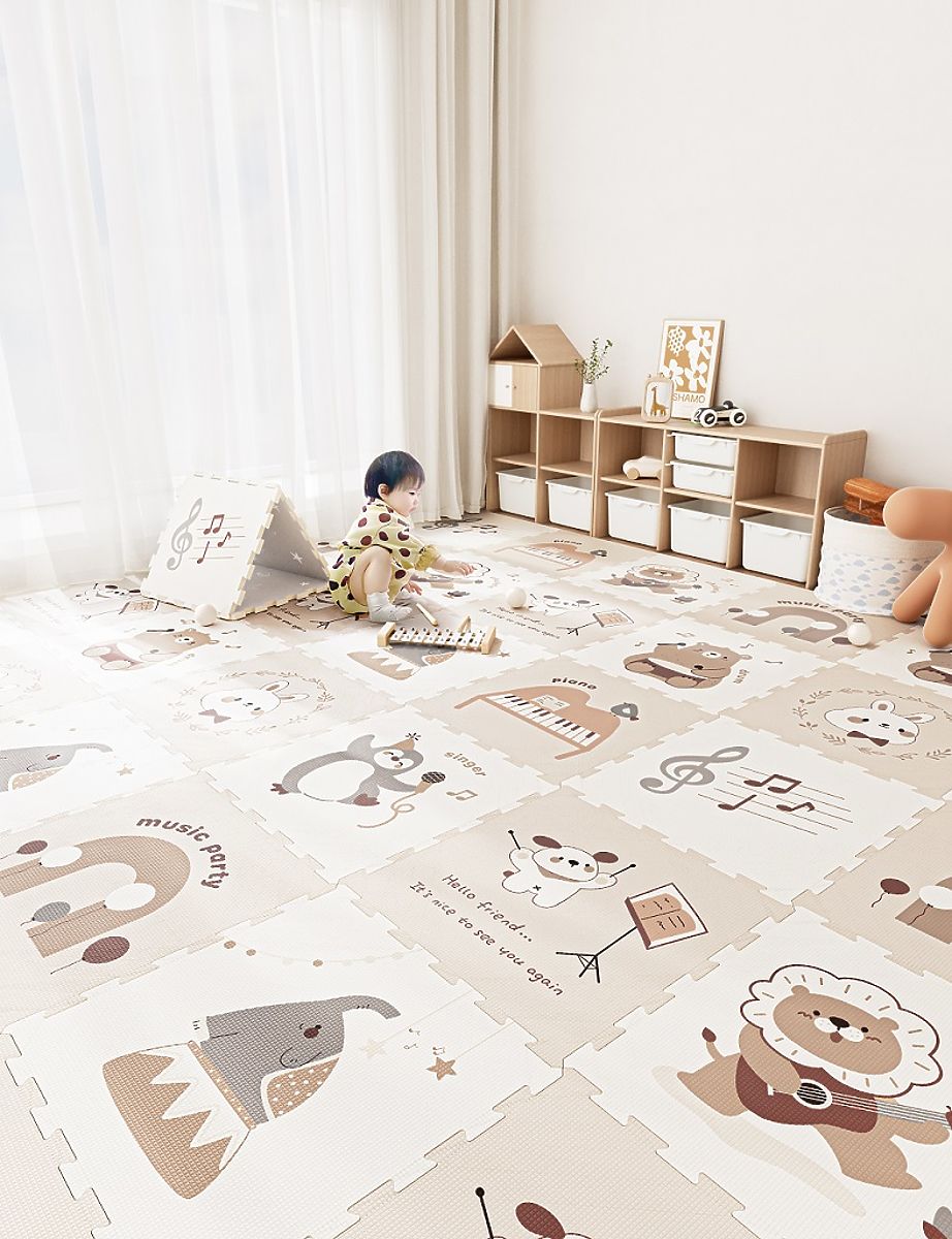 The foam play mat consists of 9 squares that easily connect to form a practical and comfortable play area measuring 180x180 cm. The mat is made from a soft and safe material that provides children with comfort and protection while moving on the ground. Each piece features adorable animals stylized as musicians, surrounded by music motifs and notes, which stimulate children's imagination and joy of discovery. The mat is ideal for home use and helps develop sensory perception and creativity. The combination of natural tones with white color and quality craftsmanship makes this mat a lovely addition to any room or playroom. Main features: 9 squares, soft and safe foam material, easy assembly of individual pieces, music and animal musician motifs, supports sensory perception and creativity, suitable for children from 6 months.