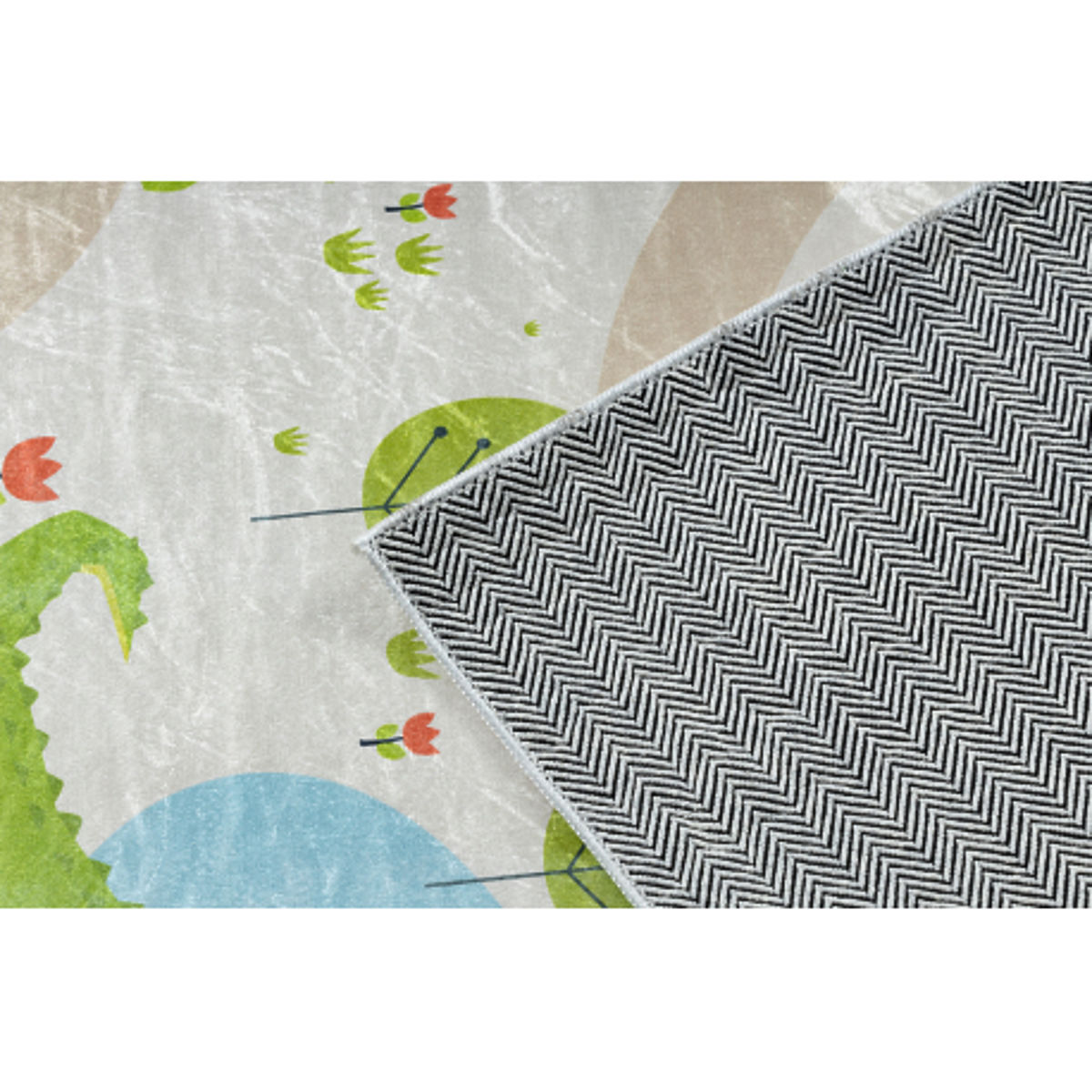 Create a cheerful and inspiring place full of adventure for your child with the rectangular BAMBINO 50230 washable rug, which combines the theme of a zoo and city streets. The combination of beige and green colors gives the rug a pleasant, playful look, making it perfect for a child's room, playroom, or nursery. Cheerful illustrations of animals and paths stimulate imagination and invite children to creative play. The rug is made of 100% polyester, which is soft to the touch, durable, and very easy to maintain. The 5 mm thickness provides a comfortable step, while the weight of 0.70 kg/m² makes the rug lightweight and easy to move. A major advantage is the machine washable feature, which makes it easy to maintain hygienic cleanliness. Additionally, the non-slip bottom layer increases safety during play and prevents the rug from moving on the floor.