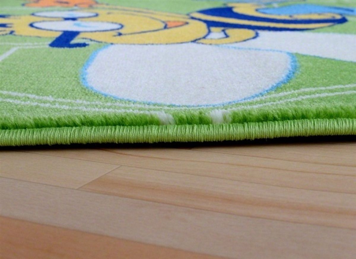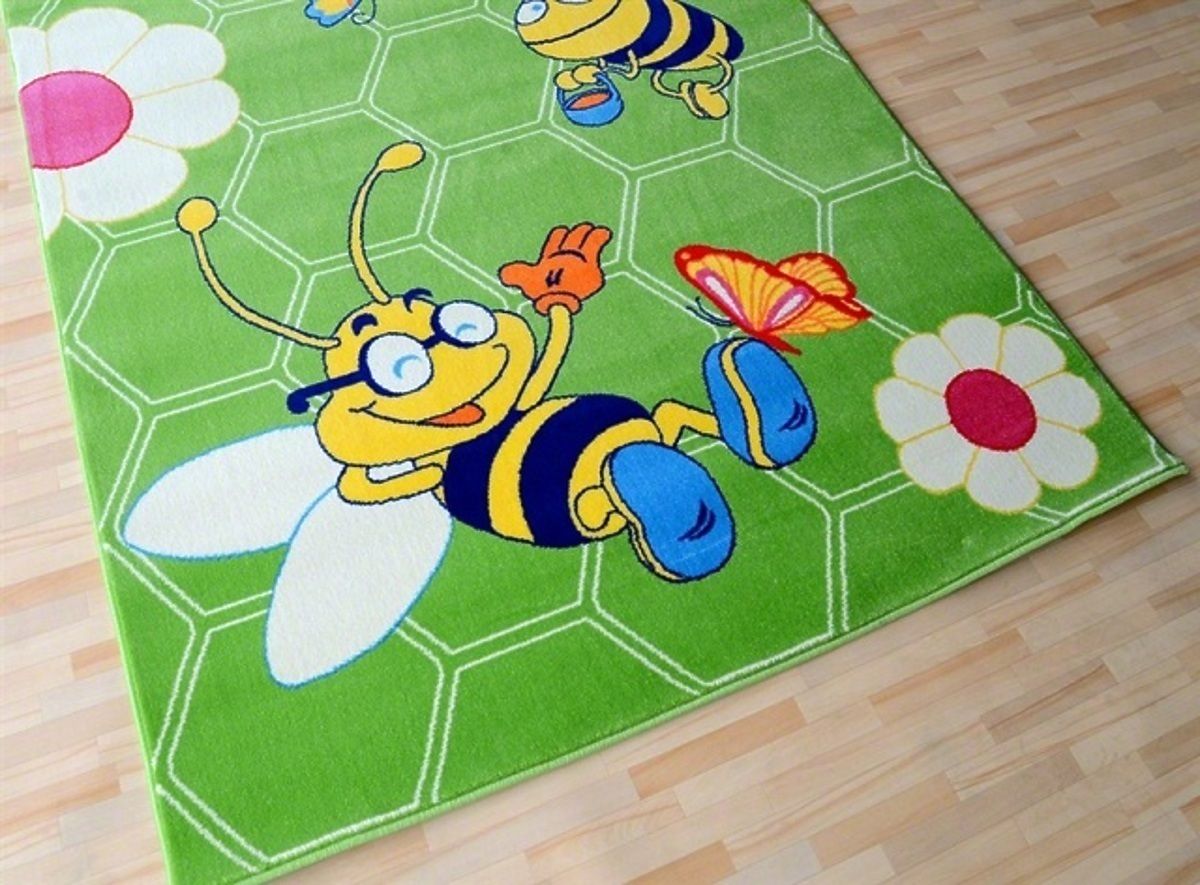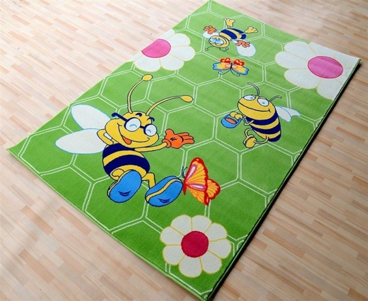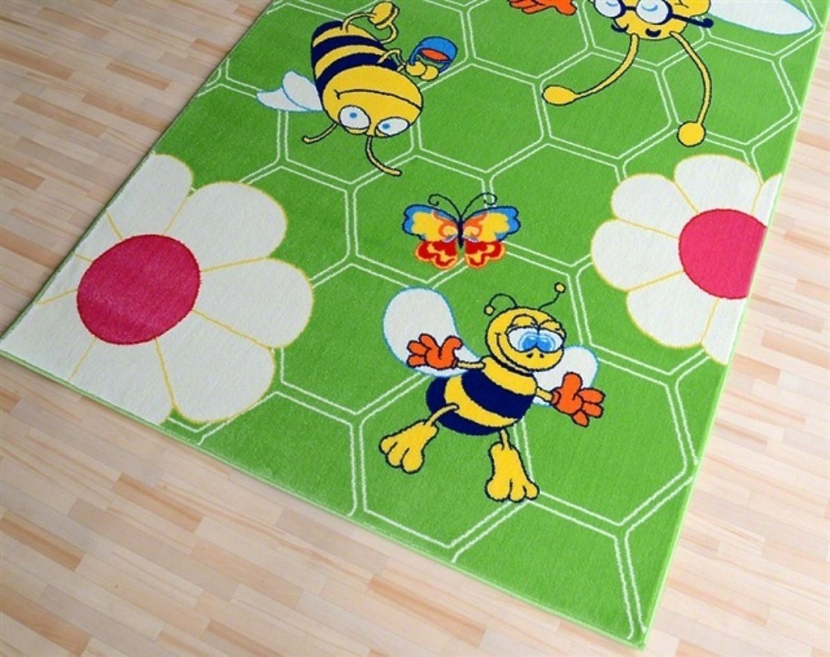 This green children's rug uses very rich colours. There are bees, flowers and butterflies on a green background. Made from yarn.