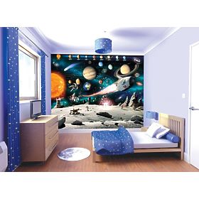 The 3D Space wall mural is divided into several individual panels. Together they create a beautiful picture that can brighten up children's bedrooms. There are 12 panels, each 58 x 122 cm in size. It is very quick and easy to apply, just follow the aforementioned instructions. For the application you will need a space of 244 x 305 cm in size.