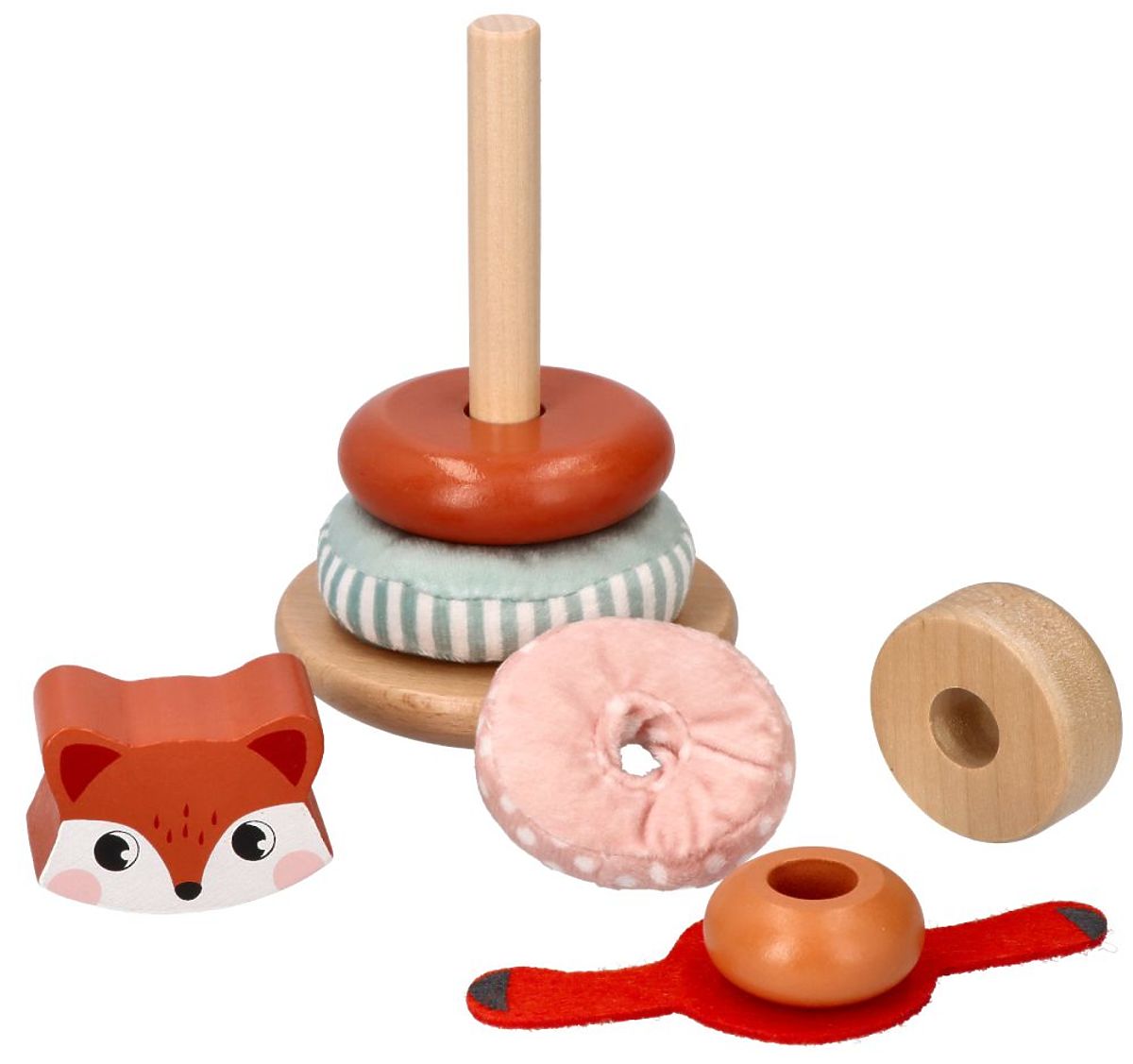 The beautiful Adam Toys pyramid is a classic toy for every young child. It captivates with its beautiful colors and design. What sets this toy apart is the combination of not only different colors but also the materials from which the rings are made. The largest ring is made of natural wood, and other elements are both wooden and fabric. The soft rings are made from materials that are pleasant to look at and touch. There is also an element in the form of fox paws that need to be placed in the correct position. The entire pyramid is crowned by a cheerful fox head.