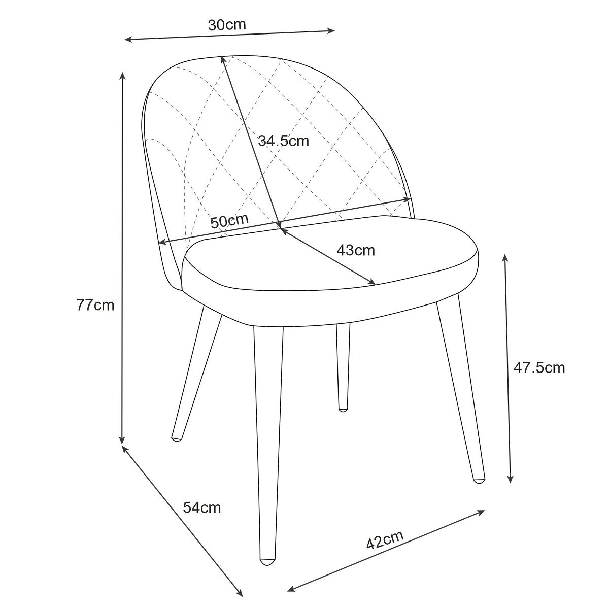 The seat of the SJ.077 chair features a flat shape and is finished with smooth, velvet fabric. The filling consists of medium-hard upholstery foam. The seat is 43 cm long and 53 cm wide.