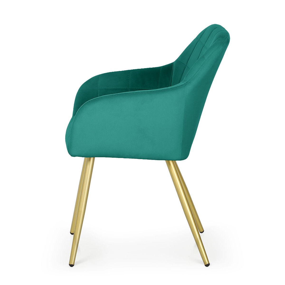 Emerald green upholstered chair with gold legs and velvet fabric. .. more