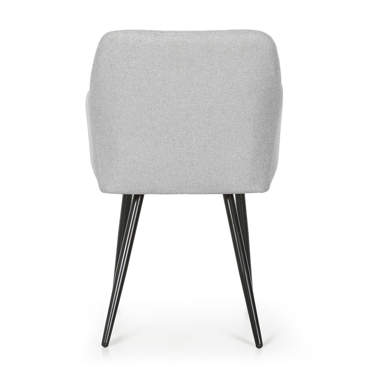 Set of 6 light gray upholstered chairs with black legs and Lumos fabric. .. more
