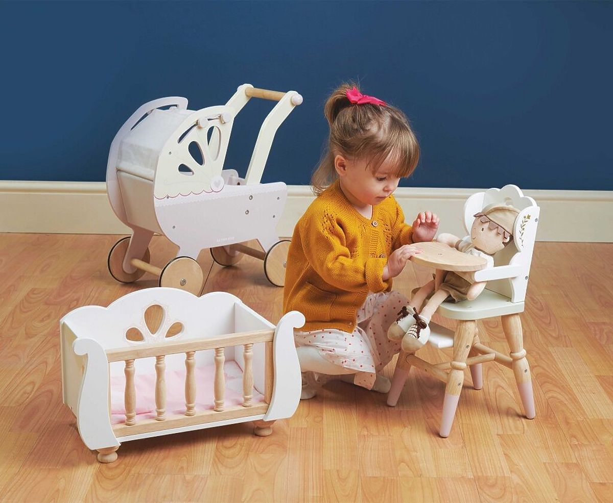 The beautiful wooden high chair is perfect for role play! Suitable for plush toys and dolls about 35 cm in size, it inspires young moms and dads to imaginative play. Made from durable and sustainable rubberwood, you won't find any plastic here, it's real eco-fun! The chair features many details, decorative legs, design cutouts in the backrest, and golden floral decorations. Its practical equipment includes a footrest and a tray. A truly realistic dining chair for hungry toys. The Sleigh bed and Sweet Dreams stroller, which you can find in the "accessories" tab, beautifully complement the chair. Toys with a purpose: All Le Toy Van toys are made with the aim to last long. Designed with love by experienced craftsmen using ethical practices and sustainable materials that are kinder to our planet. Main features: doll chair suitable for toys 30-35 cm in size ethically made from sustainable wood contains no plastic tested to the strictest standards painted with non-toxic water-based paints inspires imaginative play assists in the development of social skills and speech assembly required according to instructions upon unpacking. Toy Awards: Good Toy Guide Recommended. Honeybake collection: Toys in this collection are suitable for exploration, helping children develop imagination, social and verbal skills, and cognitive functions. The traditional design with modern details will surely entertain children. Honeybake is the most award-winning Le Toy Van collection, recognized for design, quality, safety, and educational and play value.