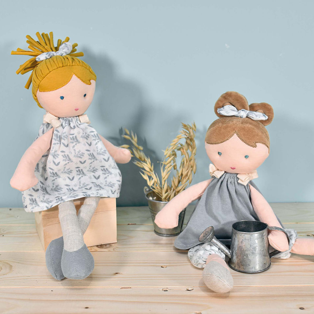 This cute little doll named Bleuette is made from organic cotton, and its filling consists of 100% recycled polyester fibers. The doll is dressed in blue and white clothes that gently match her hair bow. The doll comes in a beautiful round gift box made of natural wood. The toy meets European safety CE standards. Care: Wash in a 30° bath. Recommendation: Natural or low-temperature drying. Main features: suitable from birth, made from organic cotton, cotton face, embroidered eyes and heart-shaped mouth, packed in a round gift box made of natural wood.