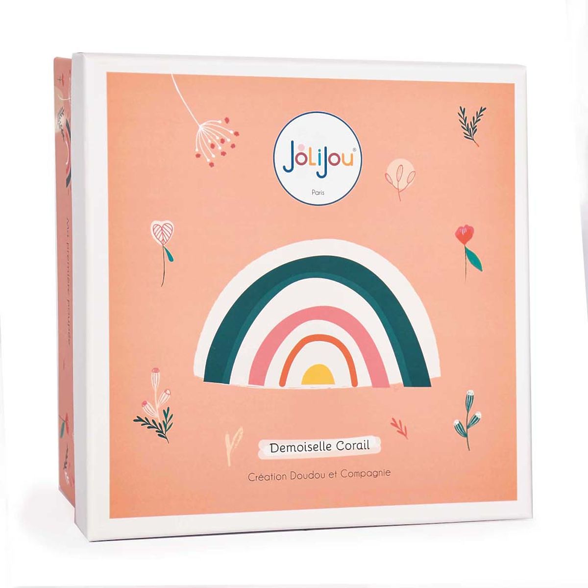 The Miss Coral doll in orange dress is the perfect companion for your little girl. The doll has embroidered eyes, nose, and mouth. Sit the doll down and entertain your child by styling her golden curly locks. Additionally, Miss Coral always has a small plush teddy bear friend attached to her hand. Care: Wash in a 30° bath. Recommendation: Natural or low-temperature drying. The toy meets European safety CE standards. Delivered in a gift box. Main features: doll with teddy bear, suitable from birth, cotton face, embroidered eyes, nose, and mouth, adjustable yellow curls.