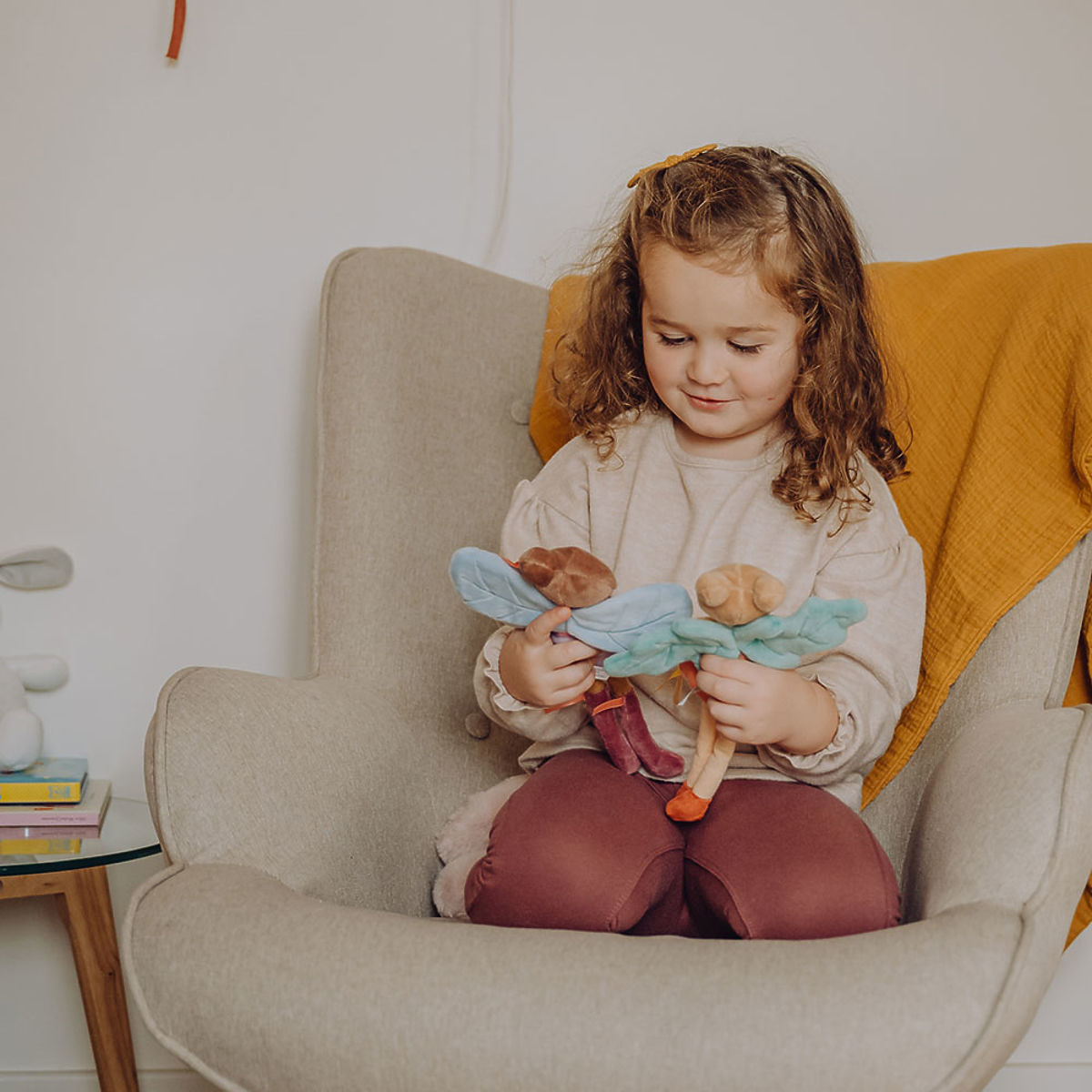 Introducing Tara, the doll in a butterfly fairy costume. The purple dress, blue wings, and purple high boots look very charming on the doll. With this lovely doll, children can enhance their imagination and transport themselves into sweet and creative stories of forest fairies. The doll comes in a gift box. Care: Wash in a 30° bath. Recommendation: Natural or low-temperature drying. The toy meets European safety CE standards. Main features: suitable from birth, cotton face, embroidered eyes and mouth, doll with accessories, gift box with a forest theme.